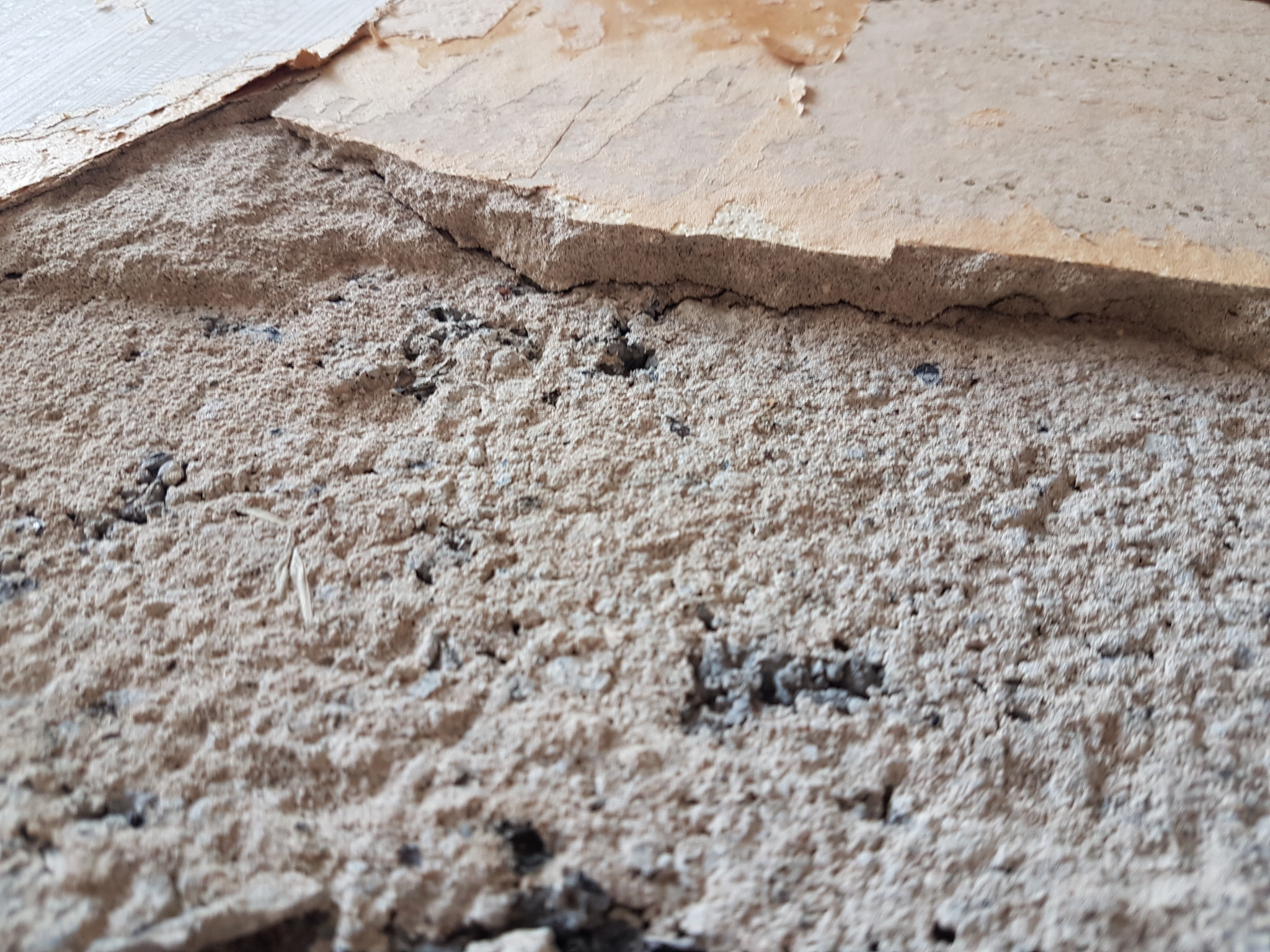 Jag håller på att renovera ett rum i lägenheten och nu har jag kommit till att fixa väggarna. Jag hade tänkt måla över den gamla tapeten, men då den var sprucken på vissa ställen behövde jag först skrapa bort den lösa tapeten. På vissa ställen visade det sig att putsen och betongen under de tre lagrena tapet inte fäster mot väggen, utan har släppt och hänger löst (se bilder). Det lät ihåligt och putsen sviktade när jag tryckte på den. Det slutade med att jag pillade bort lösa sjok av puts motsvarande ca 1 m2 innan jag kom till delar där putsen sitter mot väggen.