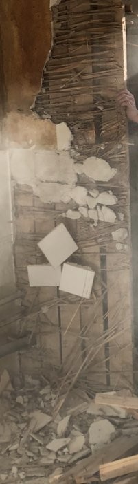 • Renoveringsprojekt som visar en halvrenoverad Kloasongvägg med trästomme och delar av puts och vass kvar.