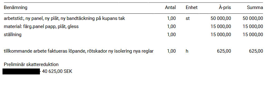 Offerten ska innehålla omklädnad med ny lockpanel + ny takplåt, samt generell renovering om något dåligt hittas.