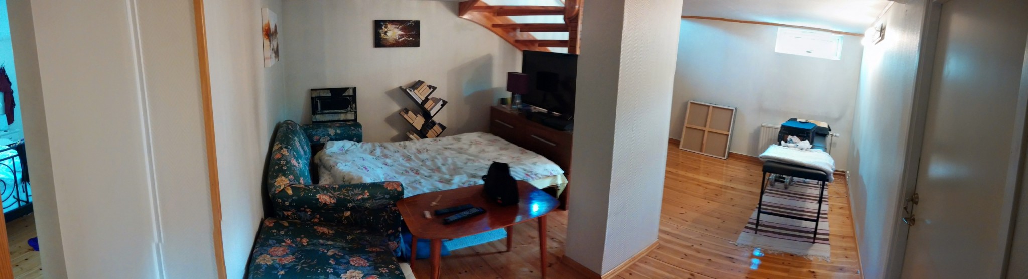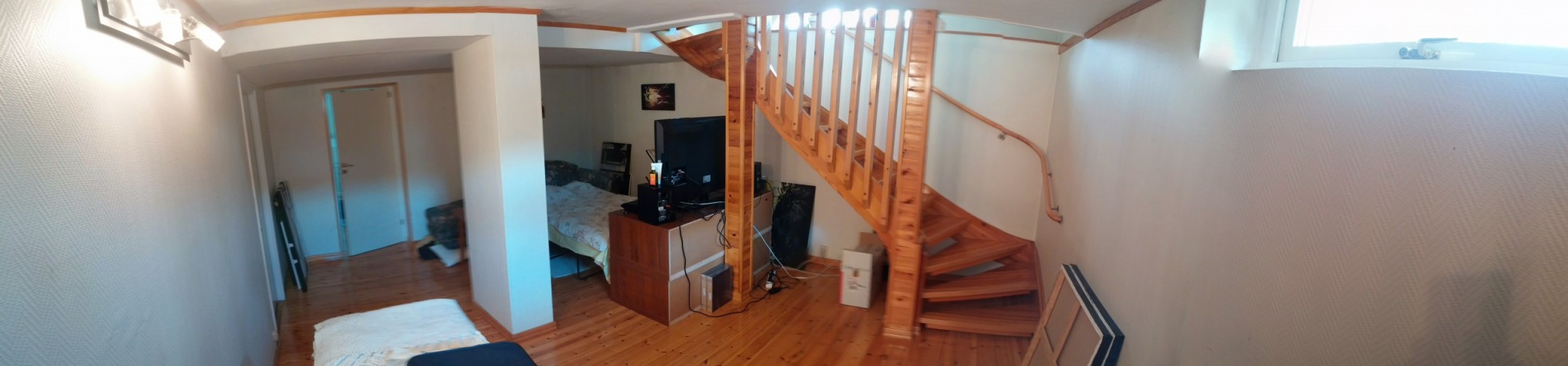 Jag ska till att renovera ett av rummen i källaren (som är inredd, isolerad och fuktfri boyta), framför allt vill jag bli av med den förskräckliga glasfibertapeten/vävtapeten som sitter på väggarna. Det sitter också en liknande vävtapet i taket, dock med ett annat mönster. Här kommer bilder på rummet:
