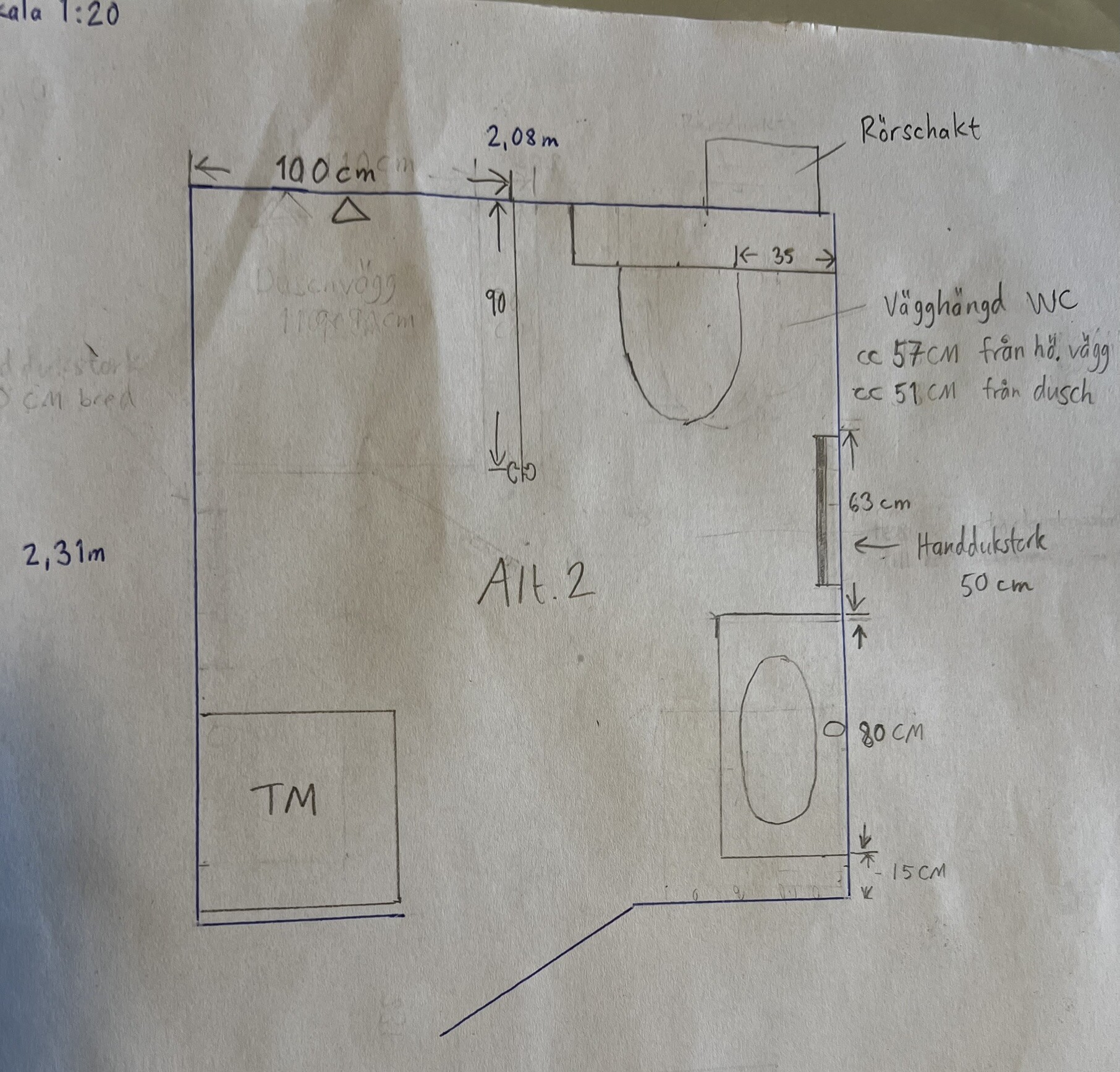 Planeringen av badrummet (som jag fick input på i en annan tråd här) blir nog ungefär som bifogad skiss.