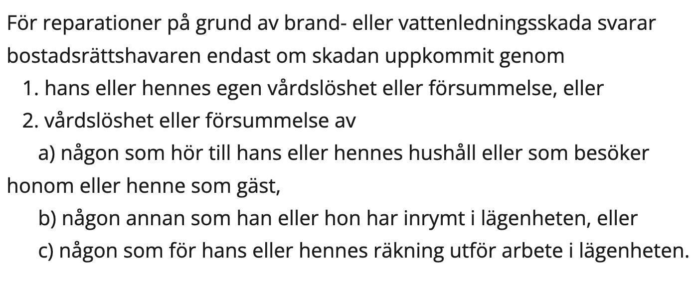 ”Bostadsrättshavaren ska hålla lägenheten i gott skick om inget annat följer av föreningens stadgar, 7 kap. 12 § 1.st bostadsrättslagen. Bostadsrättshavaren svarar dock inte för reparationer av ledningar för avlopp, gas, vatten m.m. Detta gäller dock endast om det är föreningen själv som har försett bostaden med ledningarna samt om ledningarna används till fler än en lägenhet (stamledningar), 7 kap. 12 § 2.st bostadsrättslagen.”