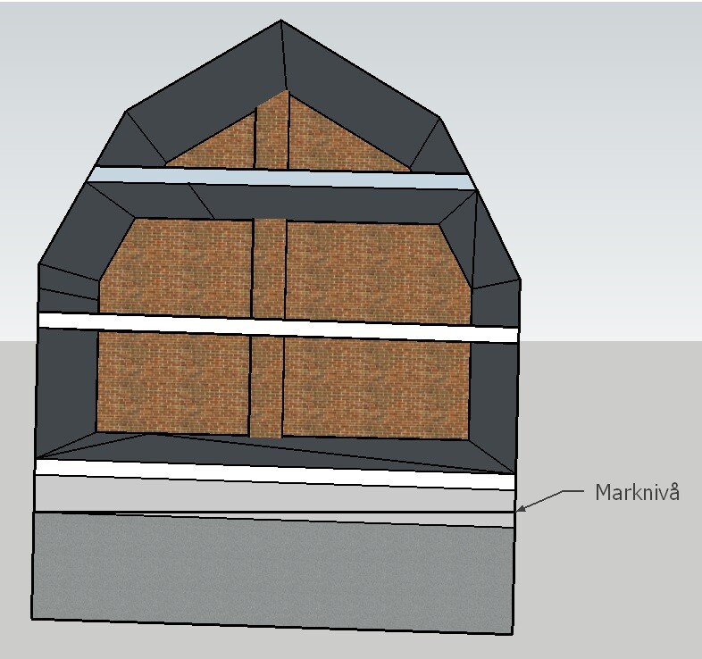Rikta golv+innertak. Blir ett steg på ca 15cm placerat strategiskt i planlösningen i varje våning.