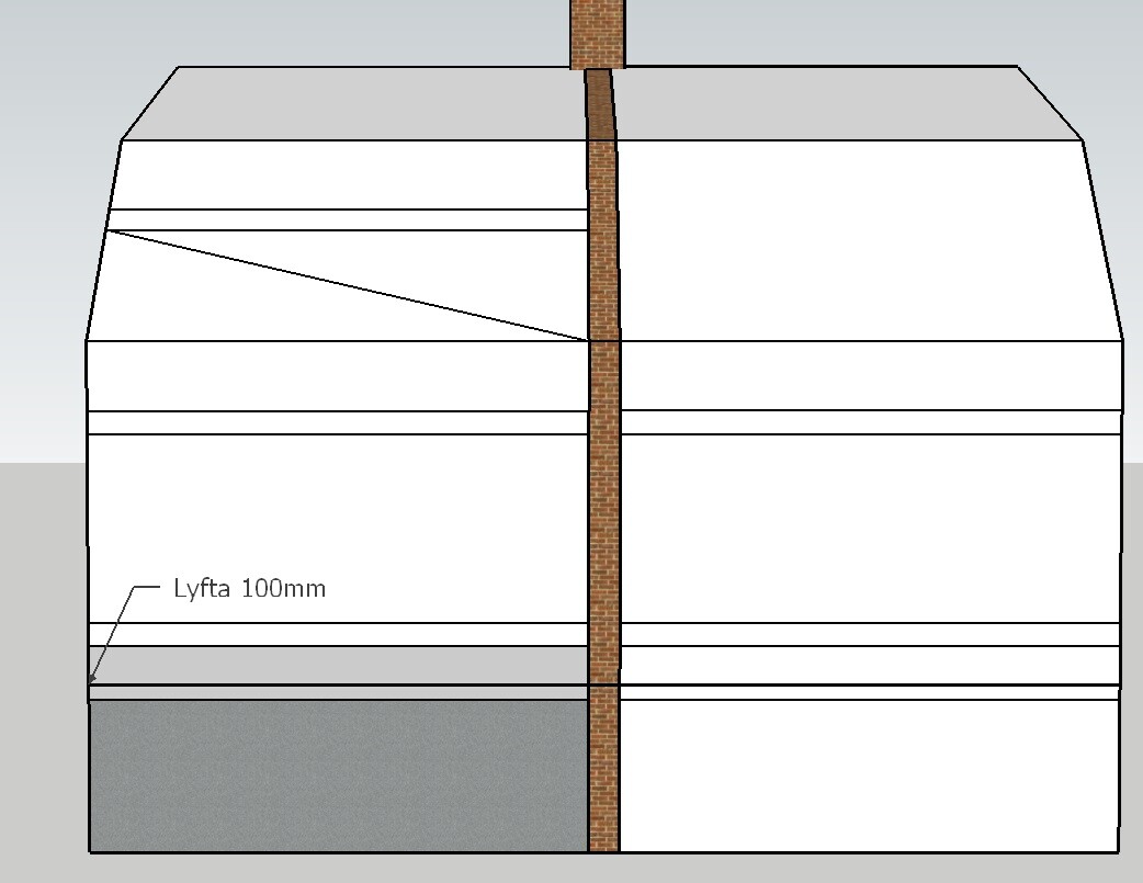 Parhuset delar en brandmur med grannen. Tyvärr har dom inte möjlighet att göra något helhetsgrepp så det har vi skrotat (de har mindre kännbara nivåskillnader). Således är det inte ett alternativ att lyfta från sulorna. Dessutom är det inte realistiskt att få med murstock och brandmur i ett samlat lyft.