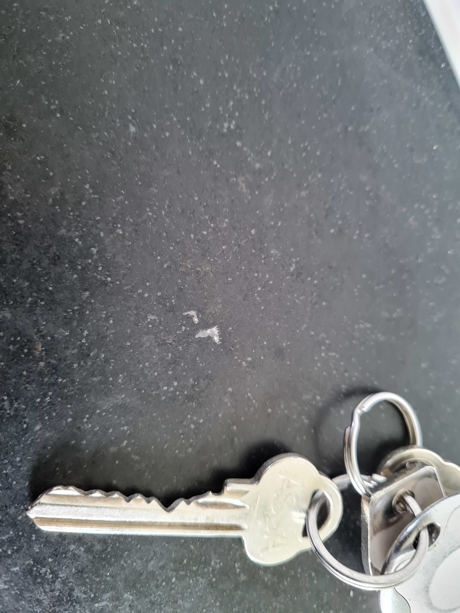 Har gjort en repa på en bänkskiva i köket ,det är en natur svart sten.Bifogar bild .Vad tror ni går det att bättra på nån sett ? Fylla i nån lim,spackel ,eller nåt annat för att blir mindre synligt ?