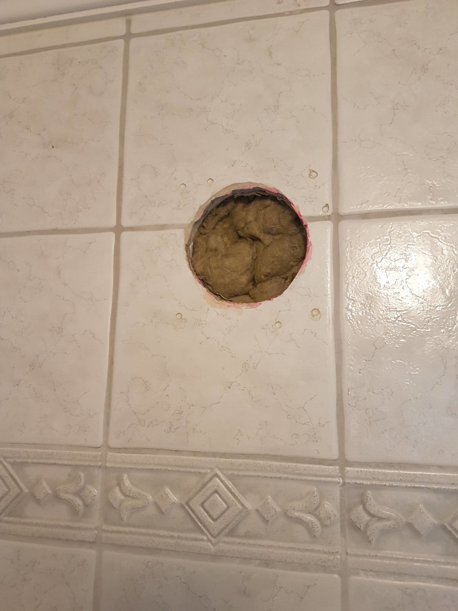 Hallå! Vi har flyttat fläkten från ytterväggen till taket. Så nu återstår detta hål. Frågan är vad behöver jag för att lappa igen det? Har nya exakt likadana plattor.