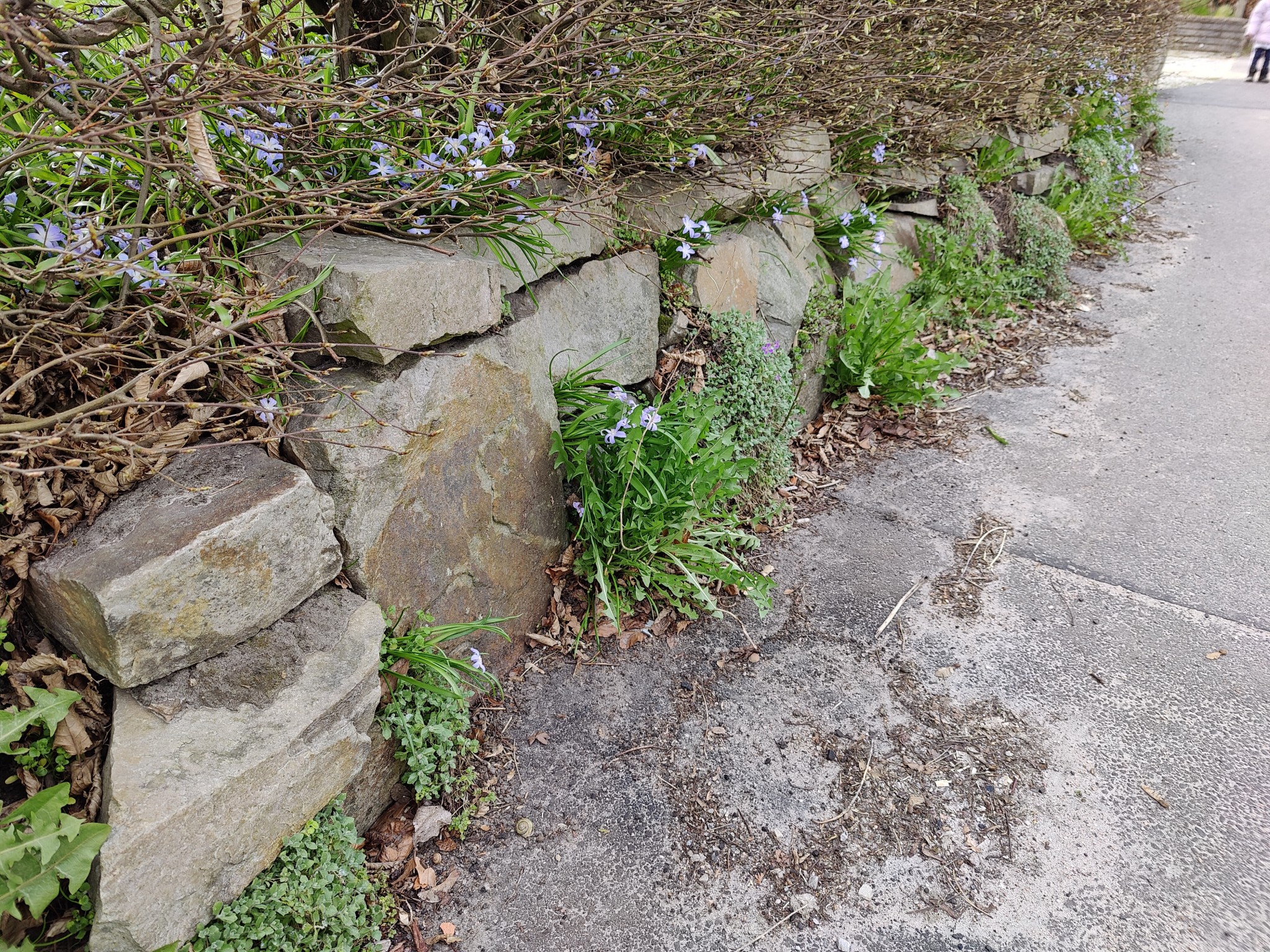 Har en tomt som är upphöjd cirka 50 cm ut mot trottoaren med en häck av avenbok precis i kant mot trottoar. För att stödja upp massorna från tomten har man en gång i tiden lagt någon slags kallmurad stödmur.