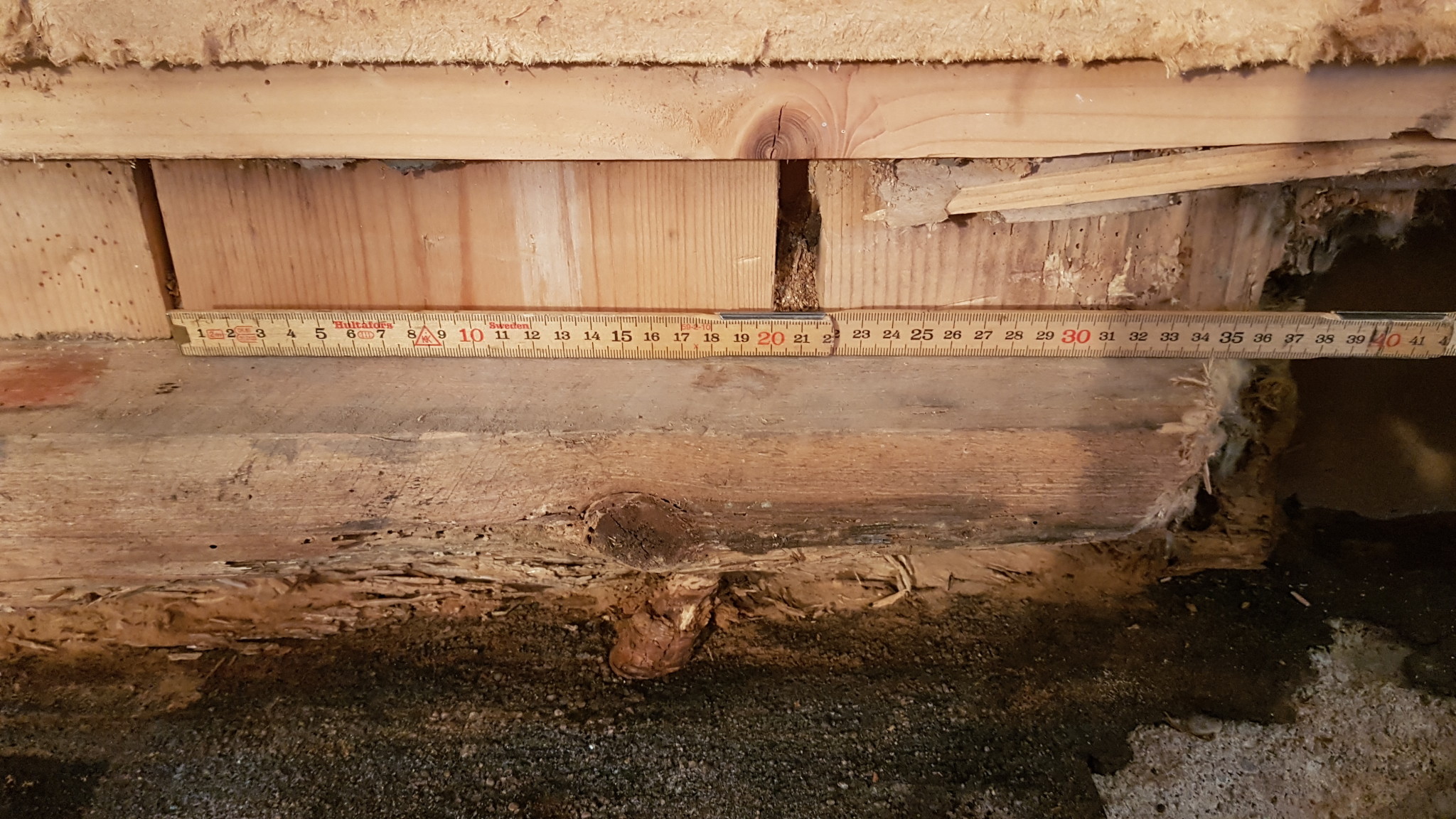 En tanke jag haft, just också för slippa lyfta med domkrafter om det går, är att märka ut ca 50 mm brett på längden och sedan såga ur en bit i taget så djupt jag vågar med vanlig cirkelsåg, någon meter i taget på de skadade ställena, sedan stämma ut så långt det är skadat på djupet och lägga i syllpapp + nytt virke. Någon som har bättre idéer? @heimlaga du brukar vara bra på det här, hur har du gjort?
