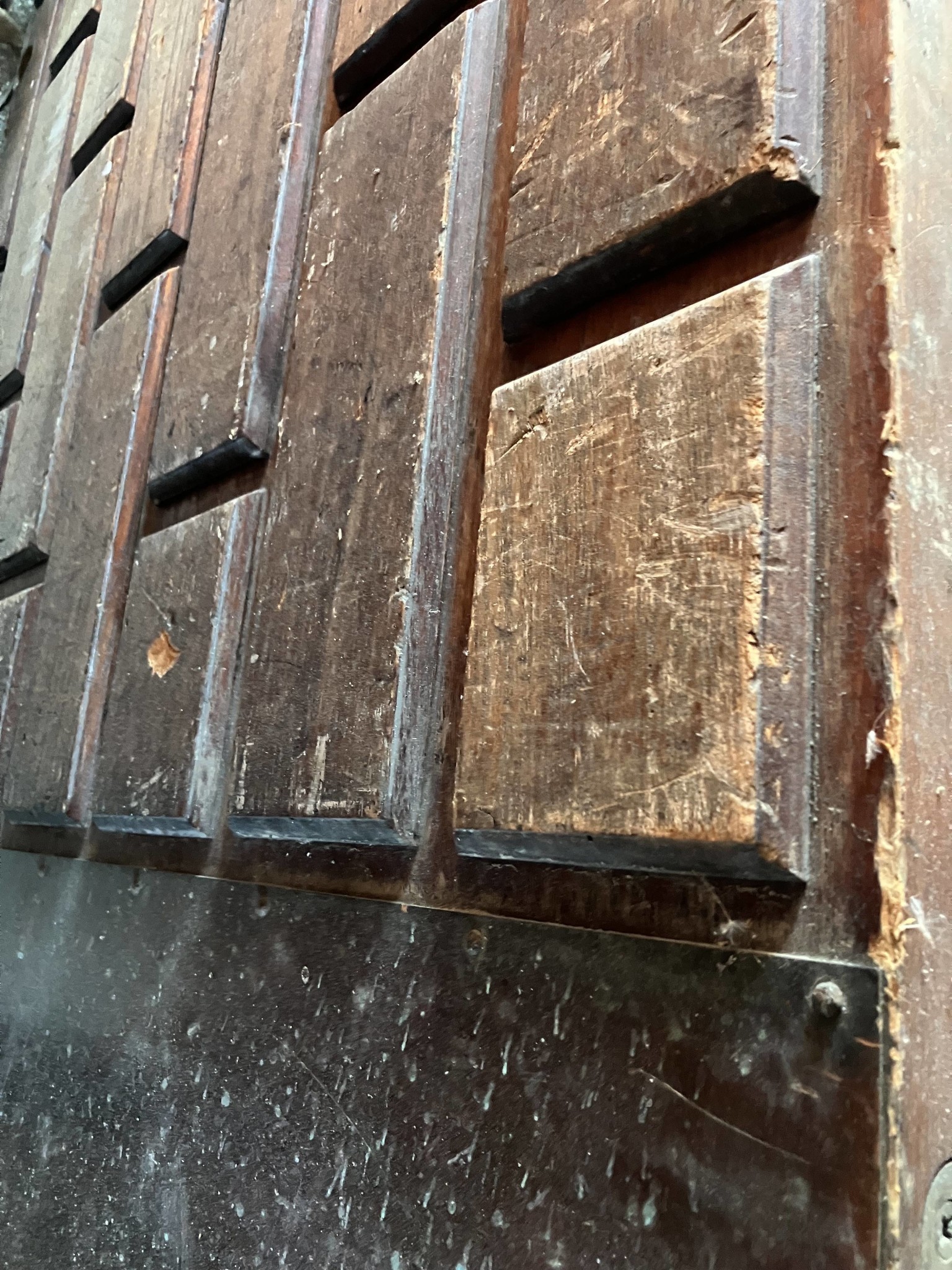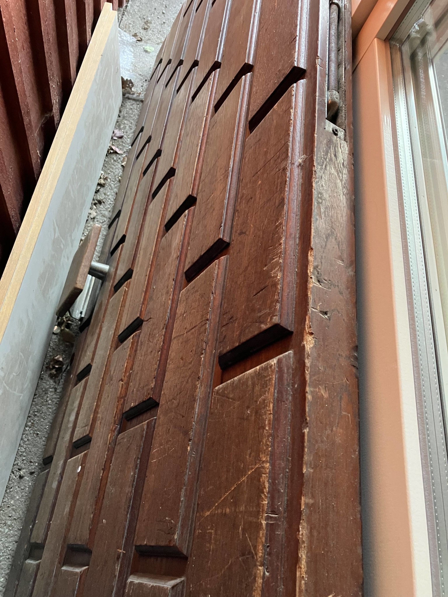 Dessa dörrar var tydligen vanliga under ett par decennier. Jag vet dock inte om det fanns fuskvarianter i faner. Massivt trä sköter man med omsorgsfull rengöring och oljning. Att byta skadade träbitar får en möbelsnickare göra. Nya sparkplåtar gör en kopparslagare. Bor du i Stockholm kan det vara en ekonomist ide att frakta hela dörren till civiliserade samhällen utanför.