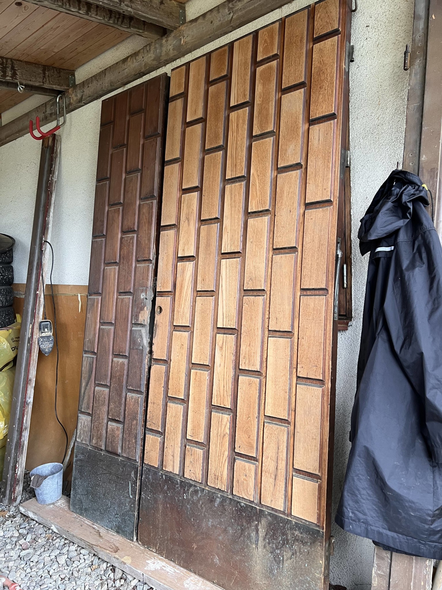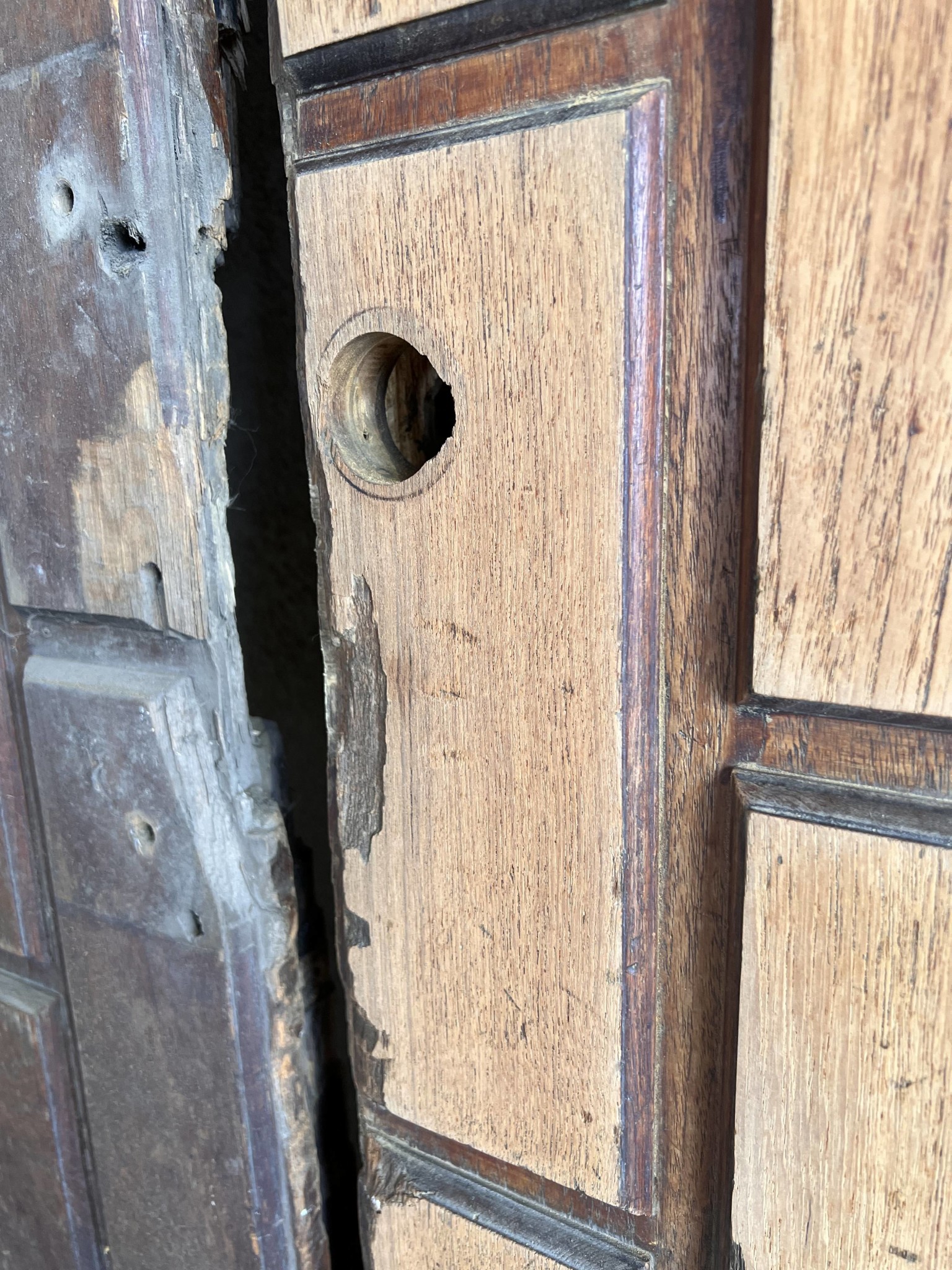 Ja denna dörr är gissningsvis från 70-talet. Konstruktionen verkar vara en ca 5 cm solid front i ek (med klossar limmade på) och som är tunnare "i mitten" där det sitter ett tjockt lager komposit, och sedan på baksidan faner.T Thomas_Blekinge skrev:Dessa dörrar var tydligen vanliga under ett par decennier. Jag vet dock inte om det fanns fuskvarianter i faner. Massivt trä sköter man med omsorgsfull rengöring och oljning. Att byta skadade träbitar får en möbelsnickare göra. Nya sparkplåtar gör en kopparslagare. Bor du i Stockholm kan det vara en ekonomist ide att frakta hela dörren till civiliserade samhällen utanför.