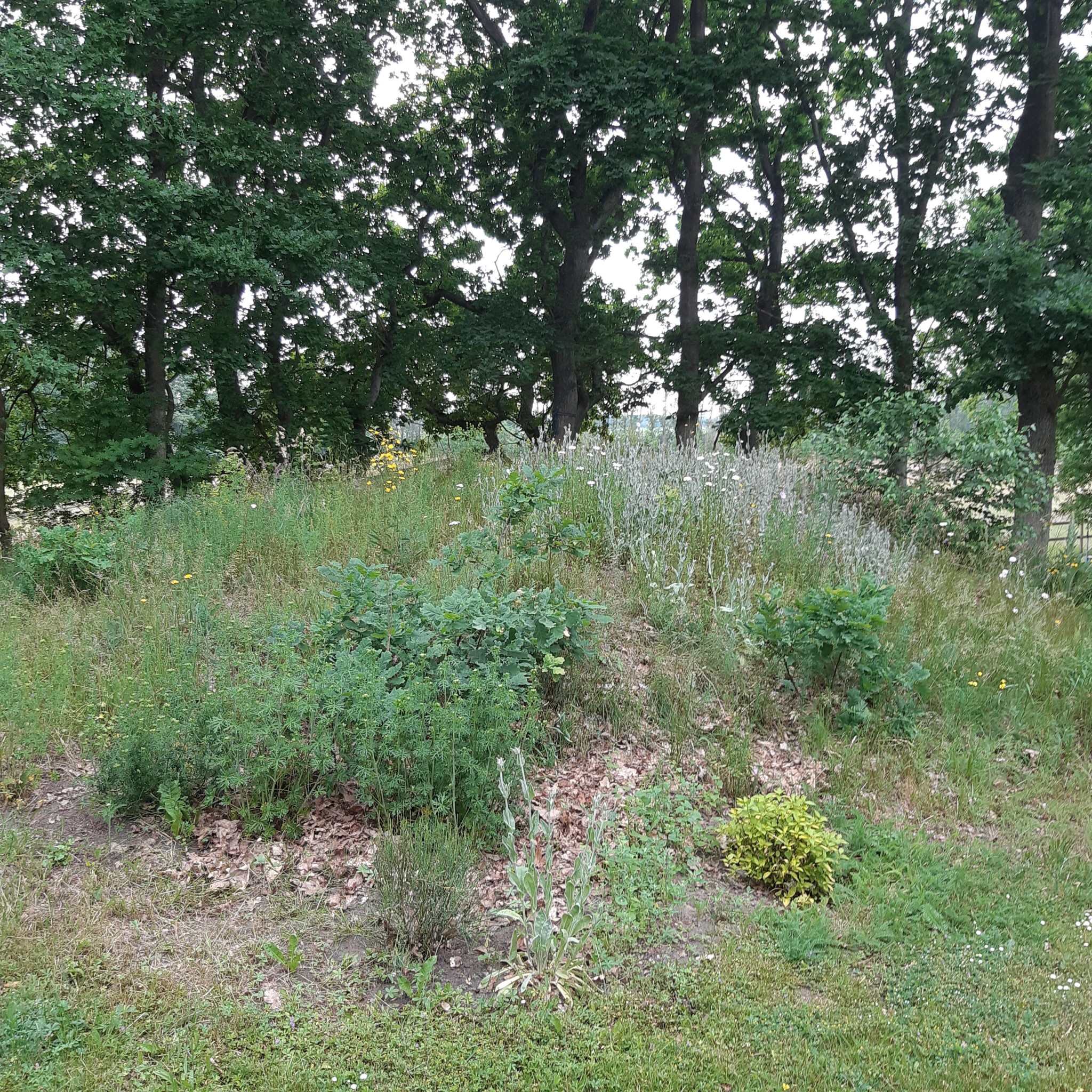 Liten sandig och torr kulle på tomten. Inte så mycket som trivs här, men några blommor hittade vi. Dessutom hem för en eller flera sorkfamiljer, sandbin, humlor, mm
