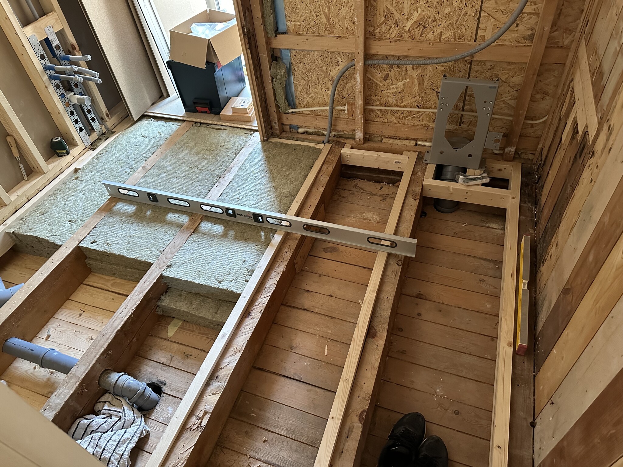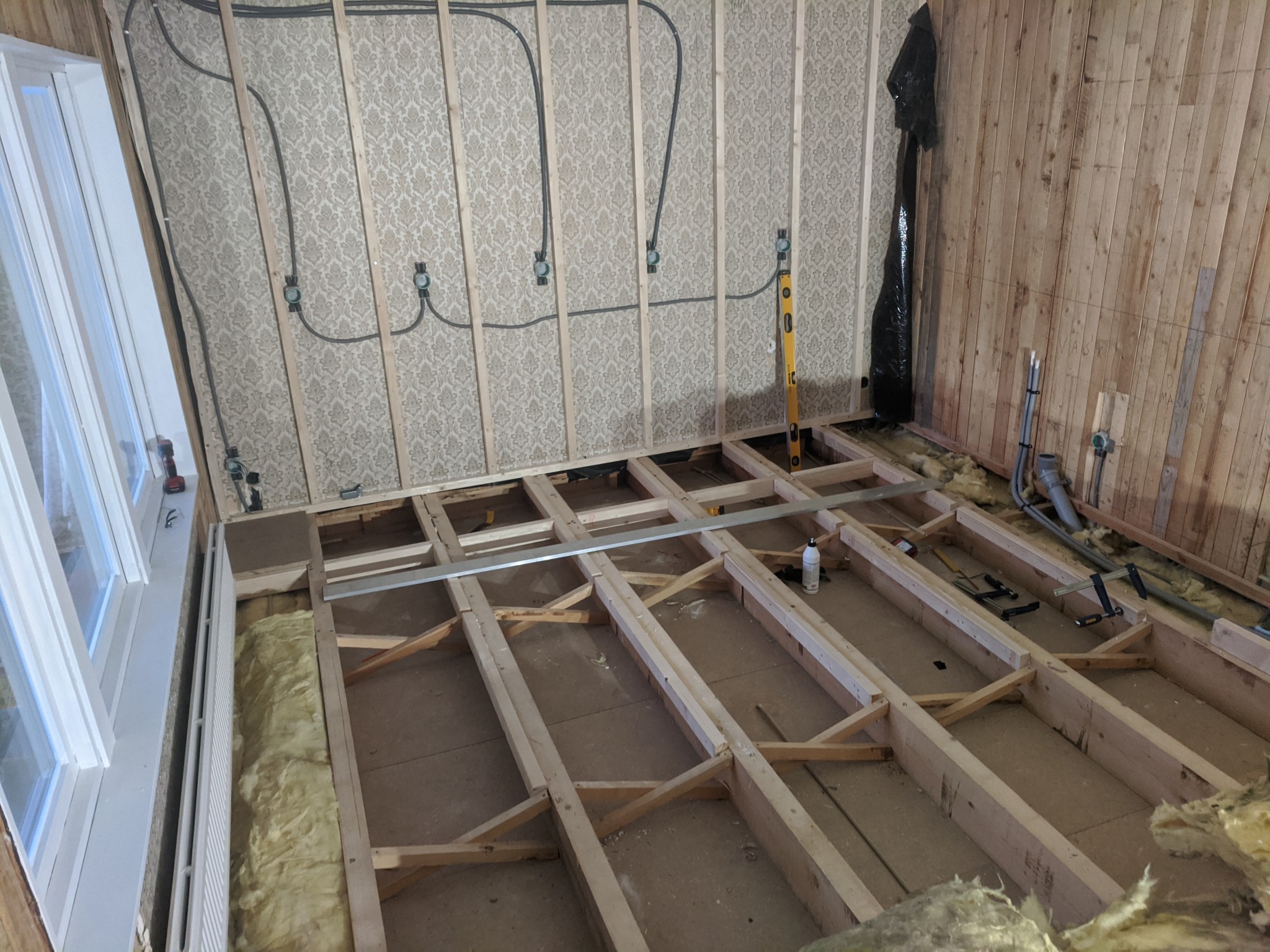 Planen är att lägga en del spårat golvspån för golvvärme och den del vanligt golvspån där vi inte kommer ha golvvärme. Ovanpå är tanken att lägga ett laminatgolv.