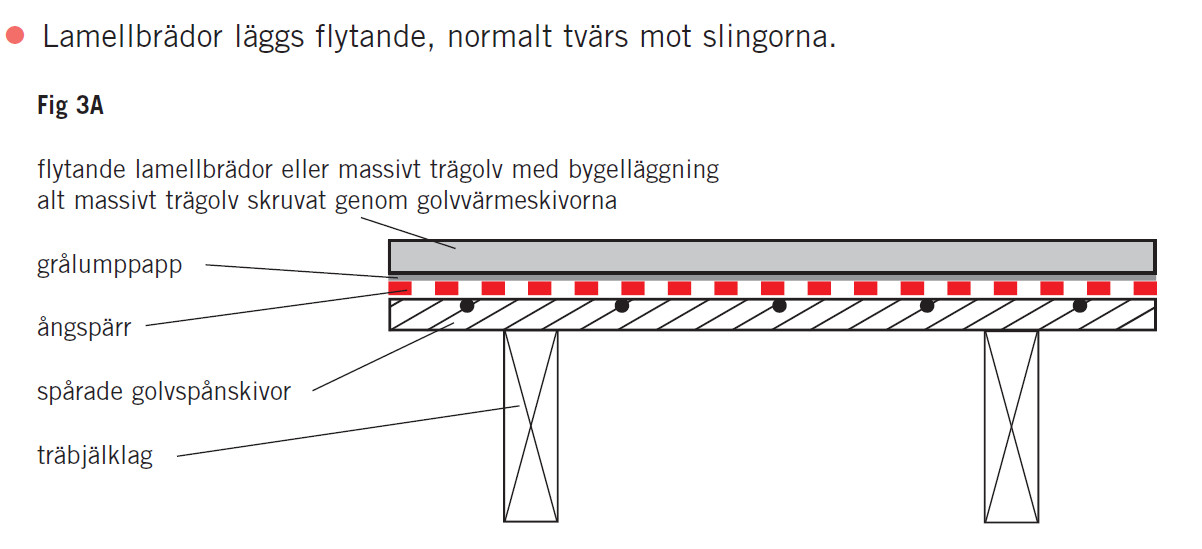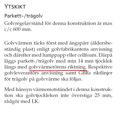 Lks monteringsanvisning för 22mm spårad spånskiva säger att parketten ska ligga längst med rören. Samtidigt hänvisar lk till GBR. GBR menar å andra sidan i sin rekommendation att parketten ska ligga tvärs över rören.