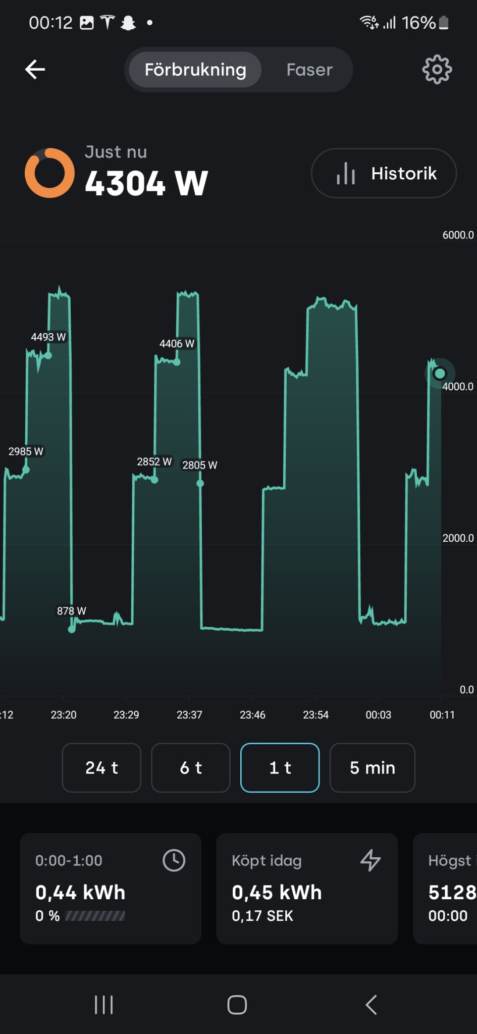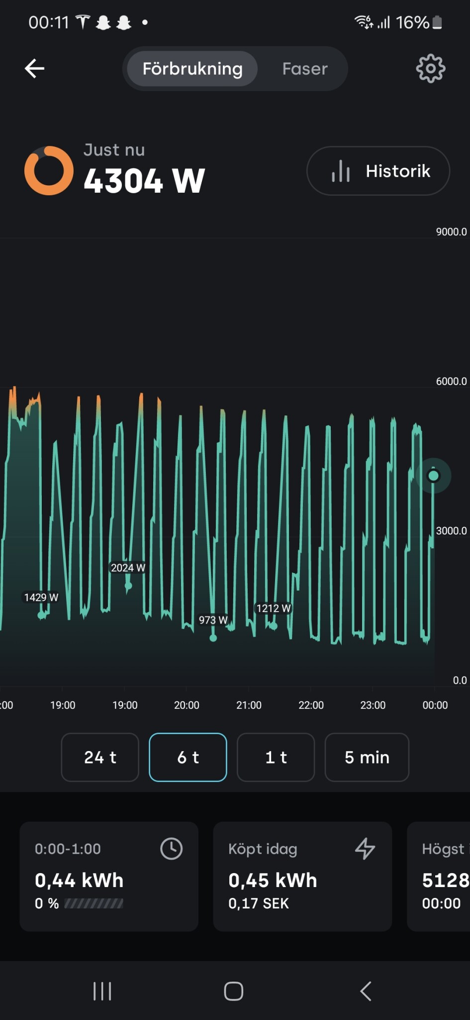 Jag upplever att elpatronen på min Nibe F370 går igång lite väl ofta, jag grundar detta på Tibber-appen som visar husets energiförbrukning. Är det verkligen normalt att elpatronen går igång enligt det mönster som visas på bilderna? Utomhustemperaturen låg vid tillfället på -2 grader och elpatronen slog till 4 ggr/h.