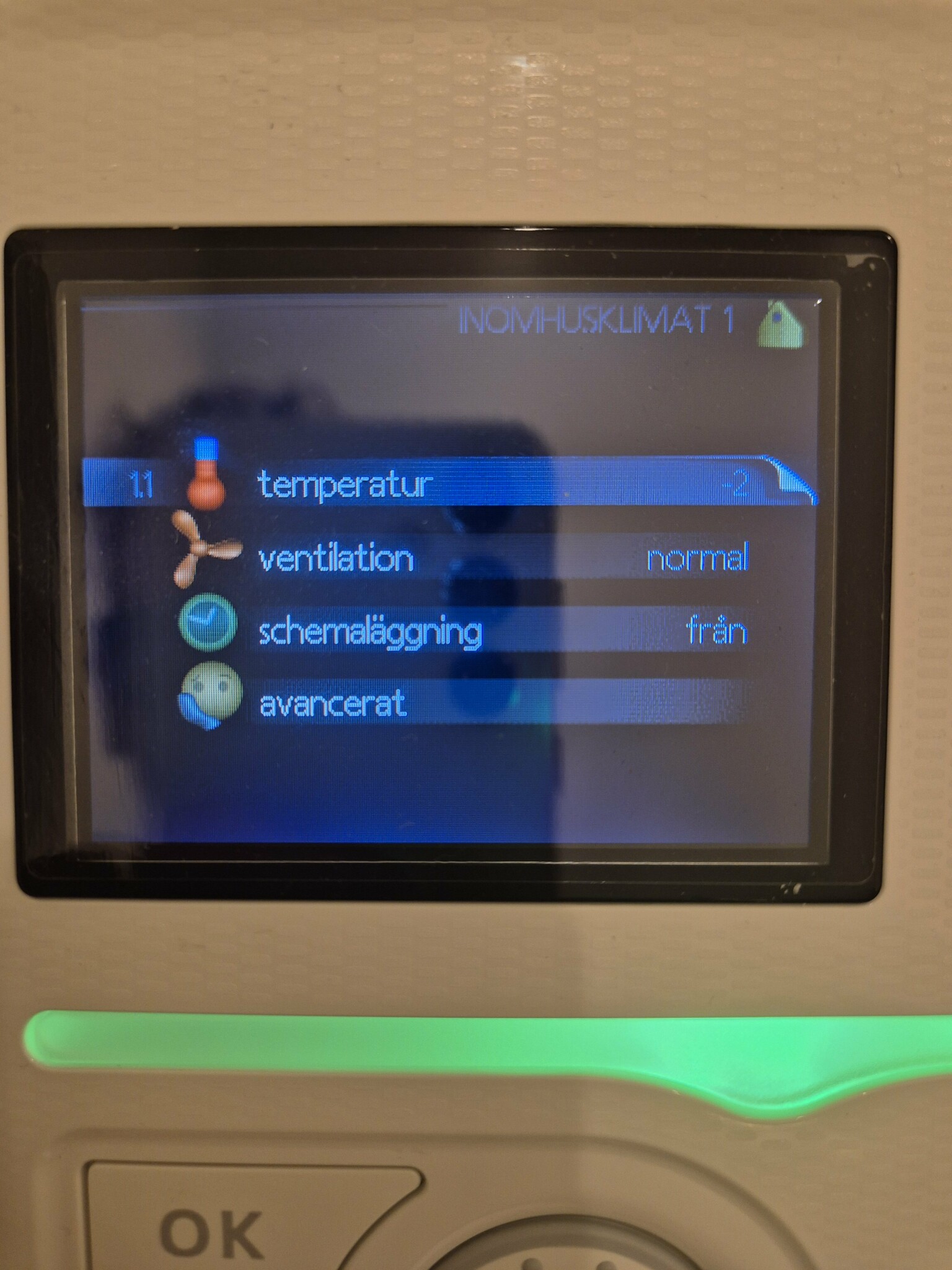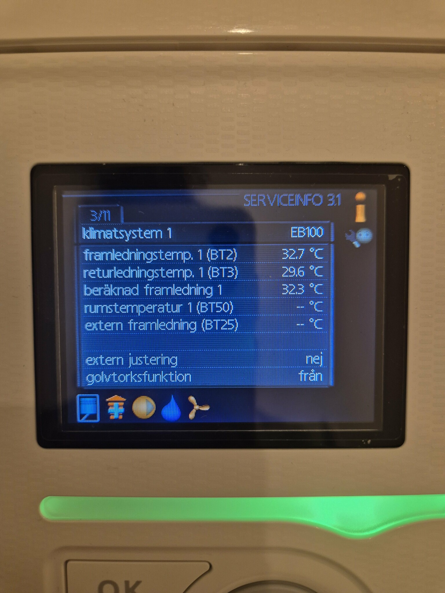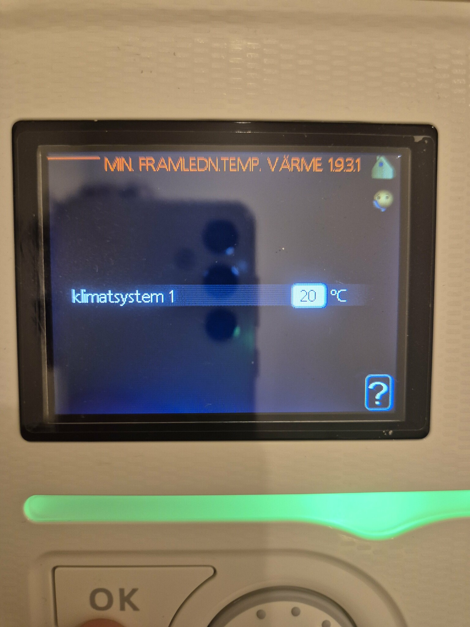 Stäng av golvvärmefördelarens termostater, ryck sladden till invertern typ. Ställ alla termostater manuellt på max och börja trimma ner värmekurvan. Tills du har önskad temperatur typ 21 grader.