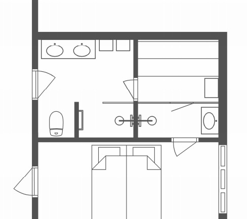 Idag har vi ett badrum på 9 kvm och en intilliggande garderob på 3 kvm. Dessa två ska byggas om till två badrum och en bastu: