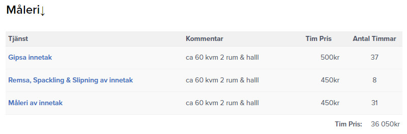 Målning totalt i överkant. skall snarare vara runt 10 timmar. Ett vardagsrumstak på 20 m2 tar normalt 1 timme per strykning i tomt rum. Med roller o skaft. Sprutning tar 15 minuter + rengörning av spruta. Ev lite tid till maskering vid behov. alltså runt 48 timmar totalt där merjobbet ligger på gipsning. Är själv målarmästare med snickare anställda.