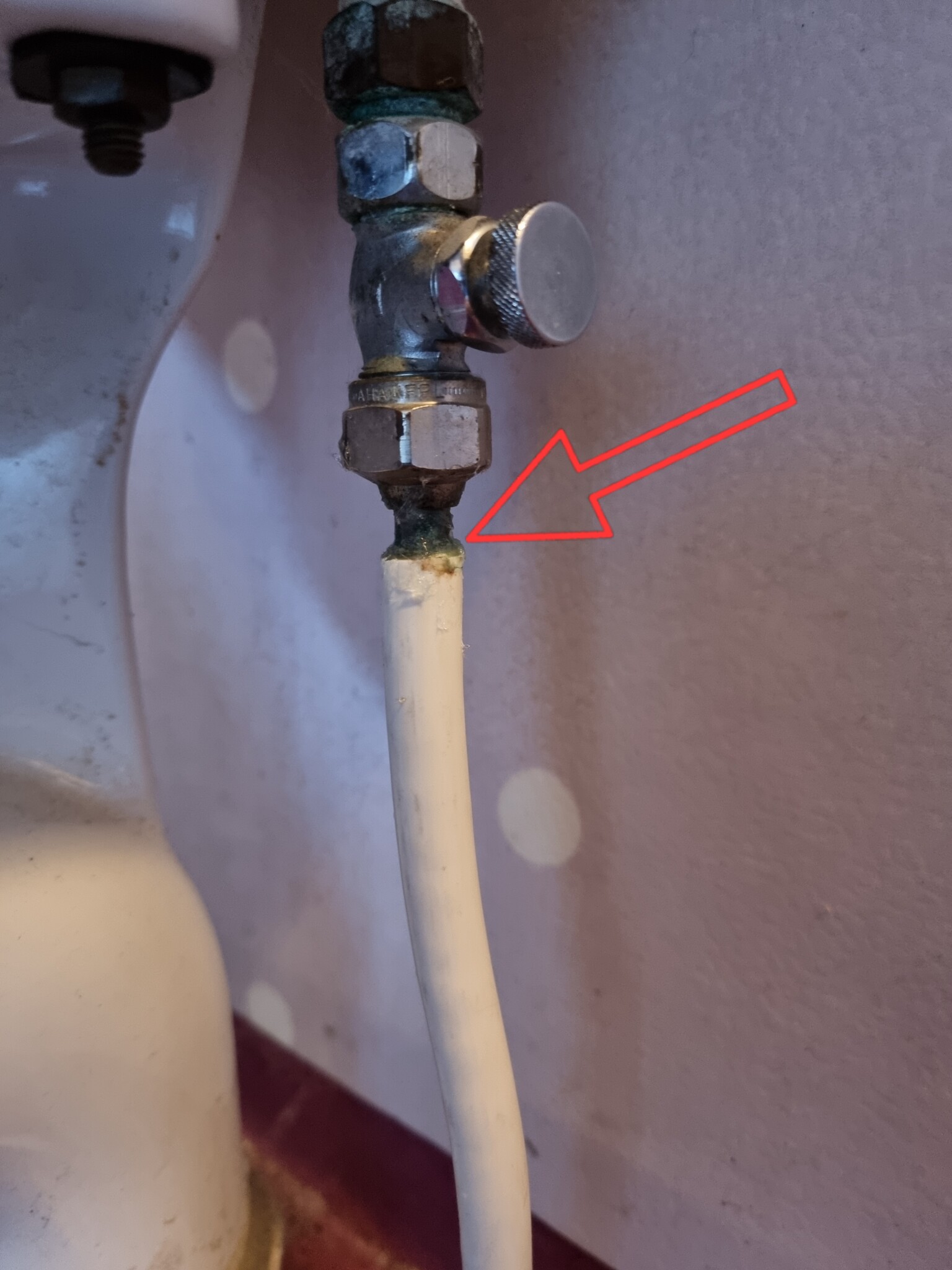 Efter jag torkade undan allt så kunde jag avgöra att vattnet ursprungar sig från det ingående vattenröret till toan.