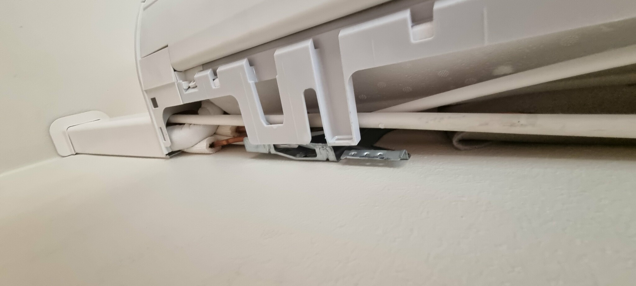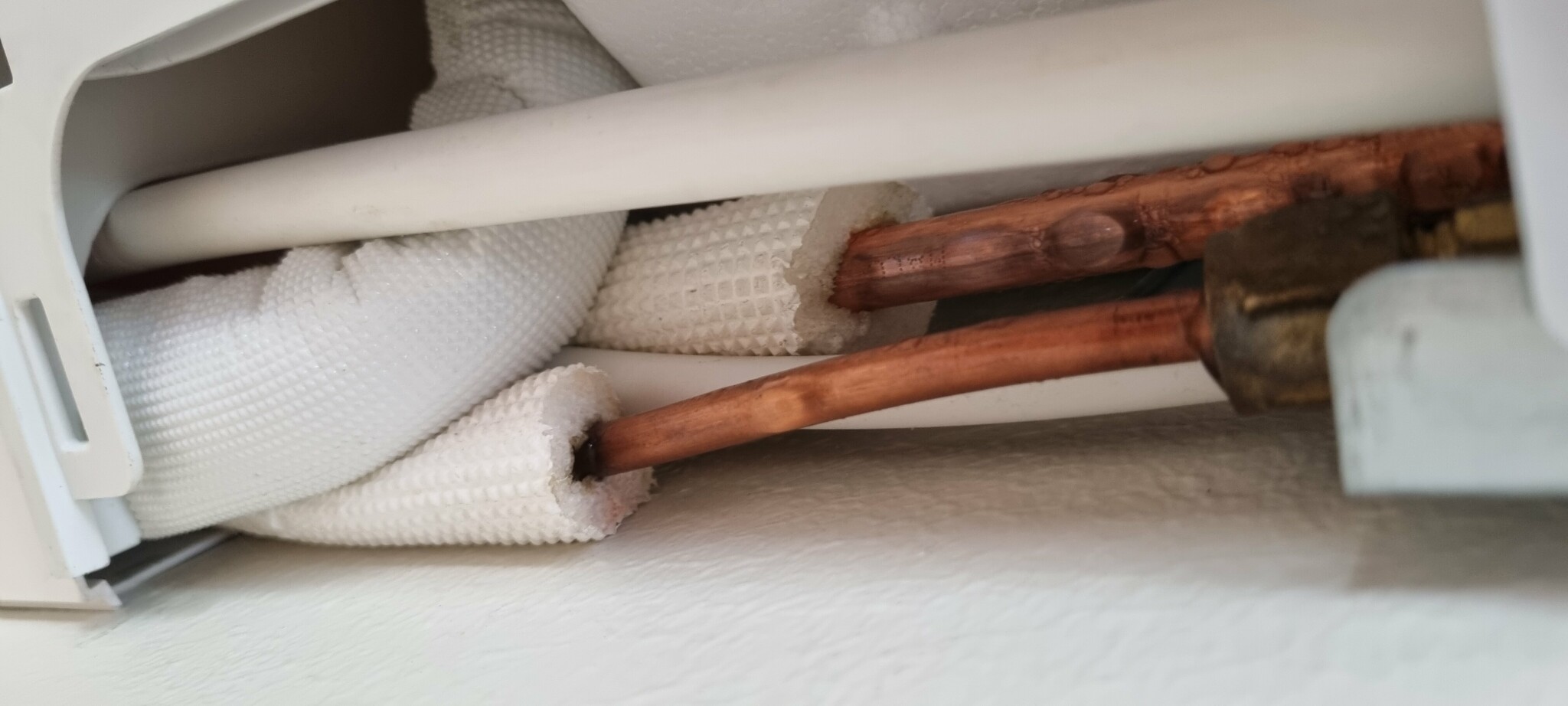 Installerade en panasonic flagship i vintras. Kört den lite som ac nu och märkte idag att golvet under innedelen hade en vattenpöl på sig. Plockade av plastluckan undertill och ser att det verkar vara kraftig kondensbildning på kopparrören det avsnitt som är oisolerat. Detta droppar sen ner på plastluckan under och vidare på golvet. Rinner också förstås in i isoleringen runt kopparrören som ju börjar lite till vänster i bild, trycker jag där på kommer det ut vatten. Är detta felinstallerat på något sätt? Slangen som ska ta upp kondens under körning i övrigt löper ju inte här, den verkar tömma vatten som den ska på utsidan av huset då det är stor pöl runt den på utsidan huset.