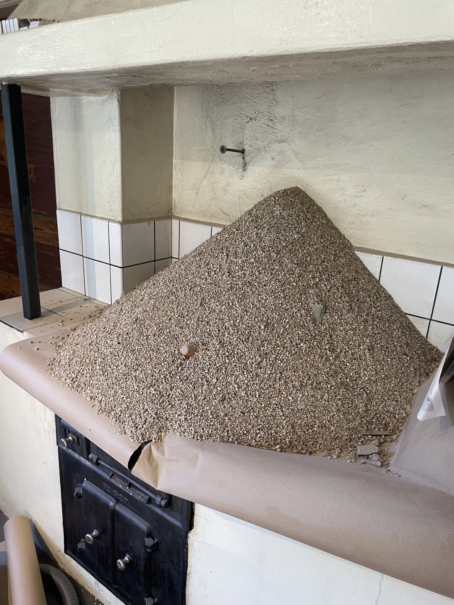 En liten uppdatering. Nyvaken en lördagmorgon började jag knacka loss en sten ovanför vedspisen. Planen var att bara ”känna på” hur lätt det var att göra upp ett arbetshål. Det gick lättare än jag trodde. Stenen lossnade och jag tog bort den försiktigt. Innanför var det lite glasfiberisolering som jag tog ut försiktigt. Sen kom det vermeculite. Cirka 500 liter. Jag hade inte förberett något så det blev till att storstäda hela köket. Efter städningen tittade jag närmare på hålet, tog ut en sten och då kom ytterligare 500 liter.