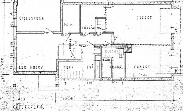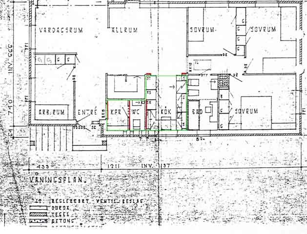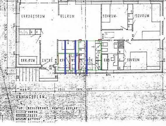 Jag tänkte utöka mitt kök till den gröna arean på ritningen. Jag funderar då på om jag riskfritt kan ta ner rödmarkerade väggar? Det jag tänker på är om det finns nån risk för att de är bärande. Mellan källare och våningsplan är det betongkasetter. Finns det nåt annat jag bör tänka på i detta projekt som ni har synpunker på, vadsomhelst? Bifogar ritningarna här samt en skiss på nytt kök. Huset är byggt -64. Blåbetongväggarna i fråga på våningsplan är ca 9cm tjocka.