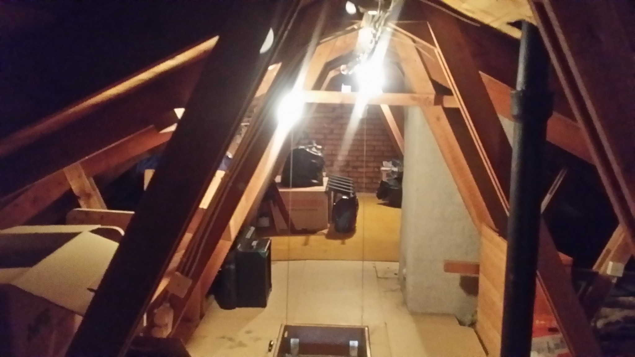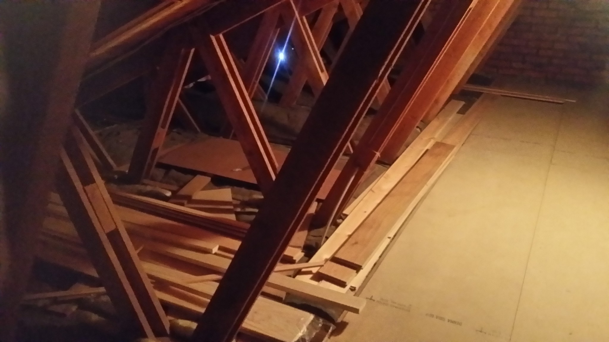 JanneL bara för att vara säker, tog ett par bilder på takstolarna. Säger det nåt om dom är självbärande eller ej? Dom är spikade i nederkant i nåt som liknar en bärlina. Vet inte om den går över hela taket eller om den slutar vid nock, ligger golvspån och isolering ivägen.