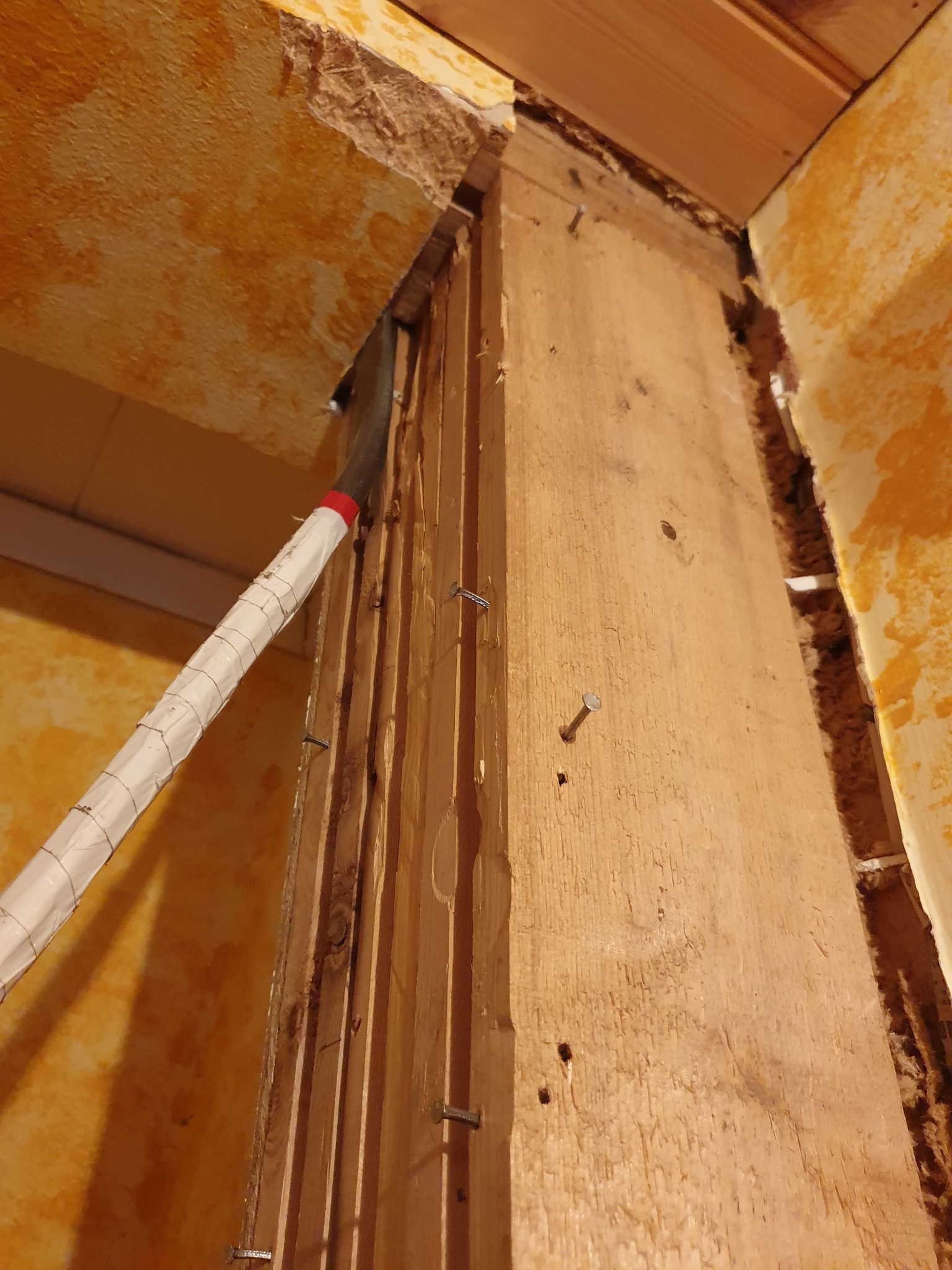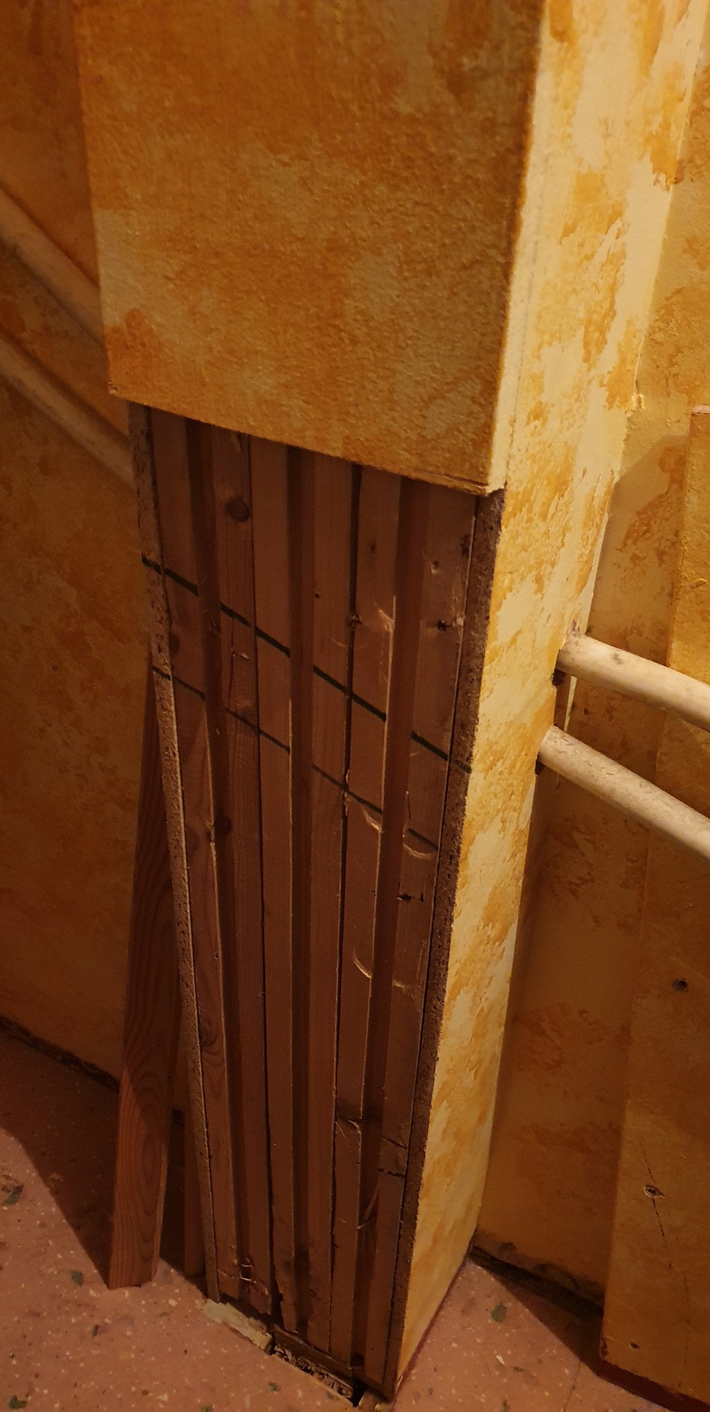 Jag började även riva ytskiktet på pelaren i klädkammaren, när jag bände med kofoten mot pelaren för att få bort spånskivorna så ruckas hela pelaren ca 0.5 cm i ovankant. Pelaren sitter ej fast i balken och det verkar inte vara så att den håller alltför mycket vikt.
