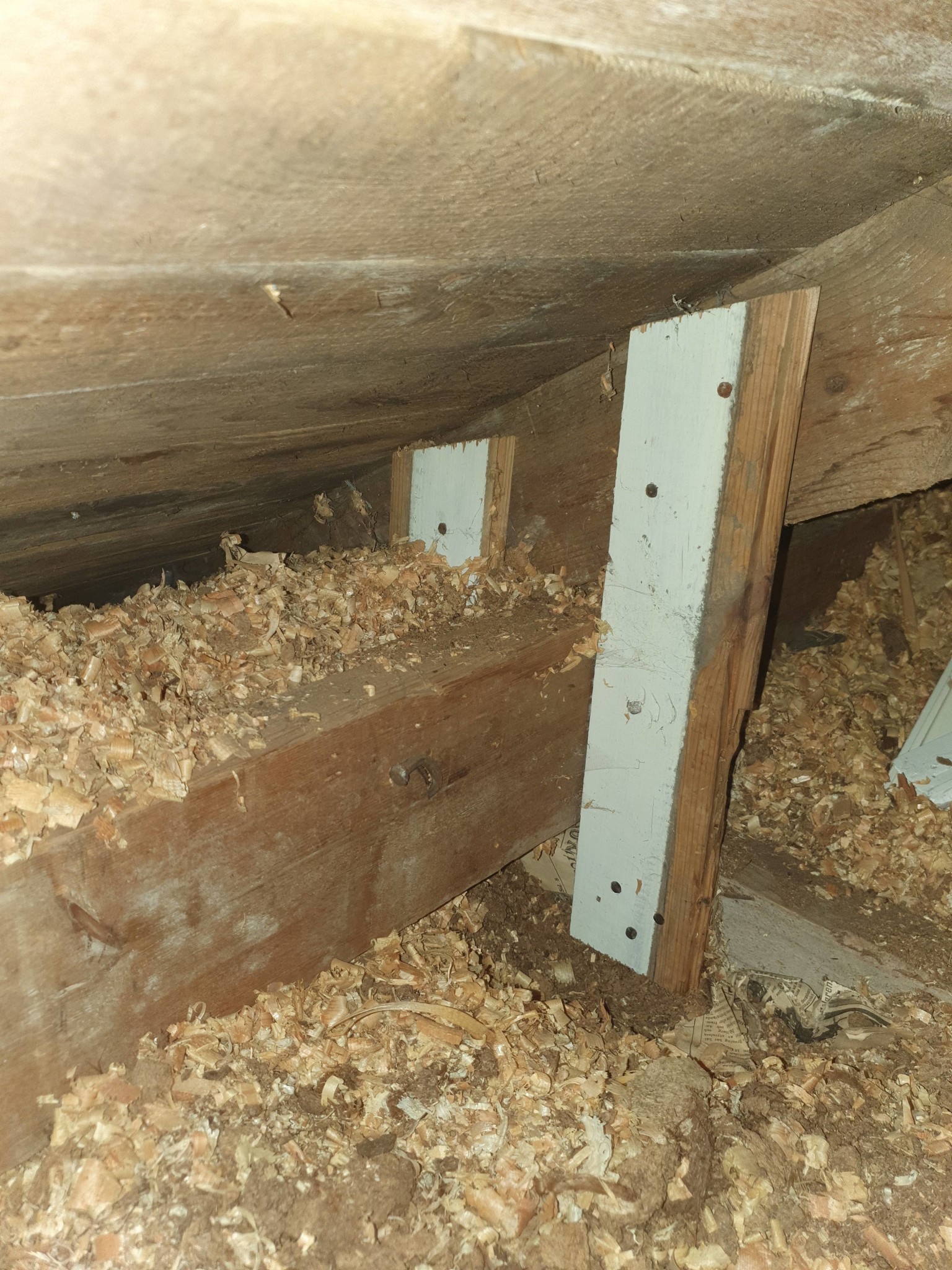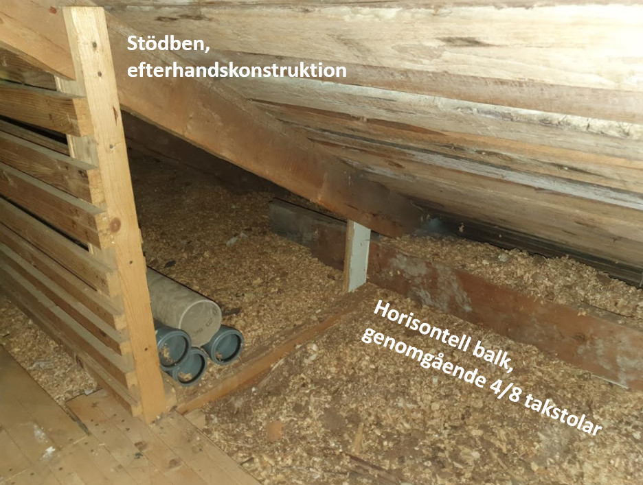 Den horisontella balken har man inte spikat fast stödben i, utan den vilar på golvbjälkarna & de vita stödbenen som syns på mina bilder är fastspikade, balken kan röra sig inom ramen för de vita stödbenen. En annan notis är att centrum på högben och bjälkslaget ligger i varandra, man har i efterhand (skulle chansa på 60-talet) satt upp stödben på samtliga 8 takstolar på båda sidorna som bilden ovan visar.