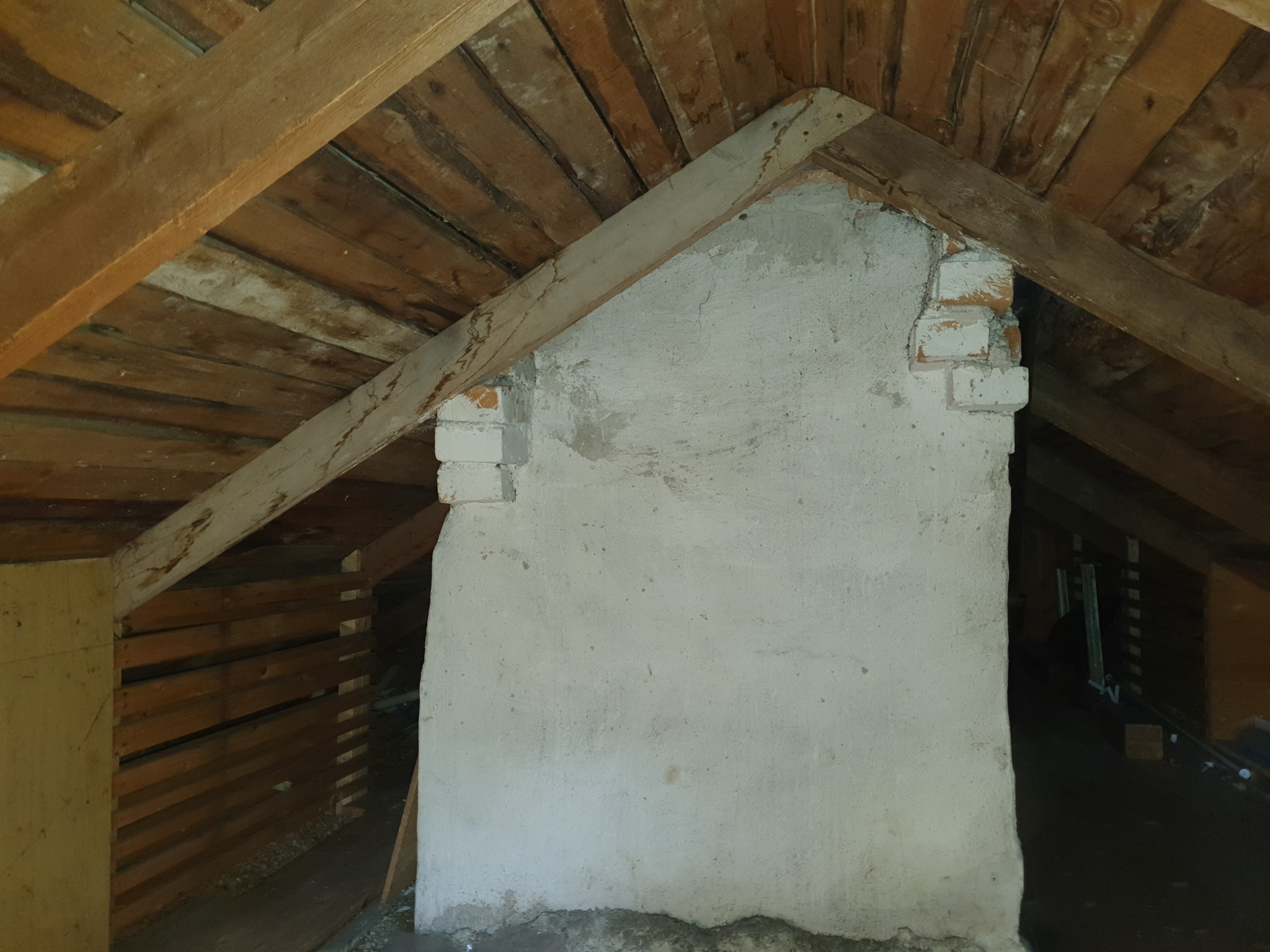 Till höger löper den horisontella balken, tills sista takstolen vid murstocken: