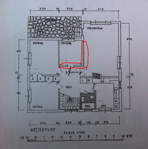 En annan del av de troligtvis bärande väggarna är redan borttagen genom att någon tidigare ägare under årens lopp förändrat ingången till köket så att denna nu ligger från vardagsrummet bredvid öppna spisen, och inte som på den här ritningen från hallen.