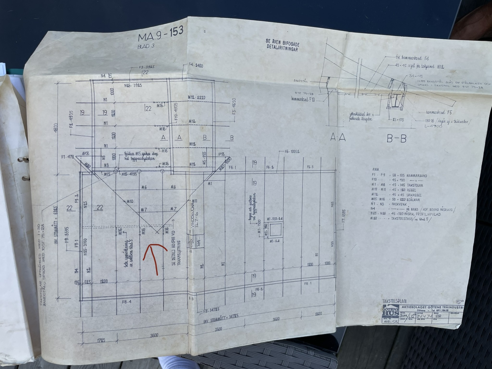 Taket har 15 graders lutning med betongpannor på och snözon 2,0-2,5.