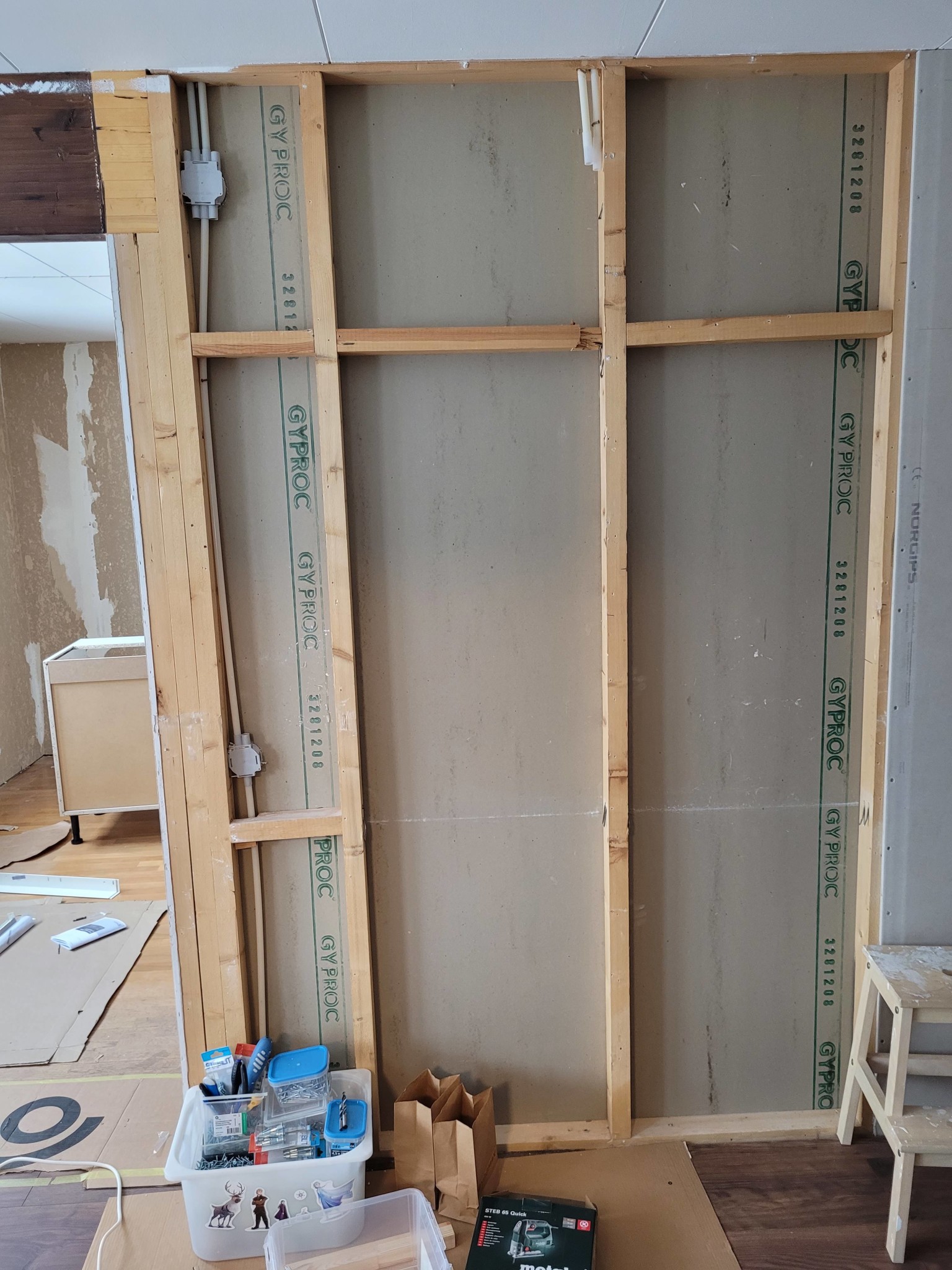 Jag önskar mig en öppning i denna vägg. Väggen avslutas idag med en trippelregel/stolpe som bär upp en limträbalk. Denna stolpe och balk ommer få vara kvar då de definitivt har en bärande funktion.