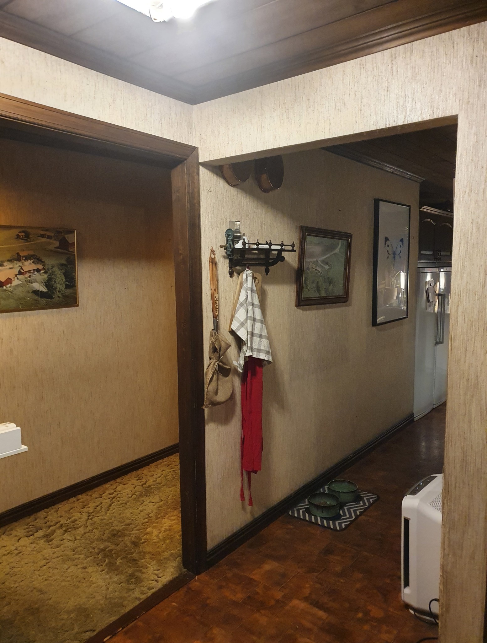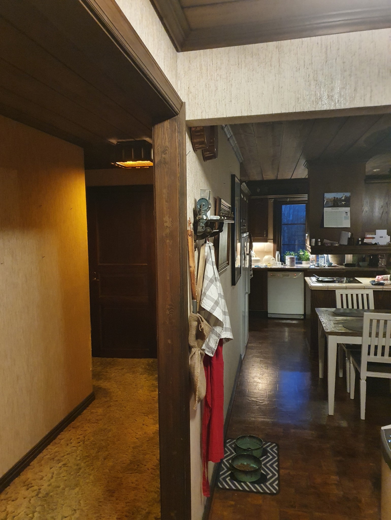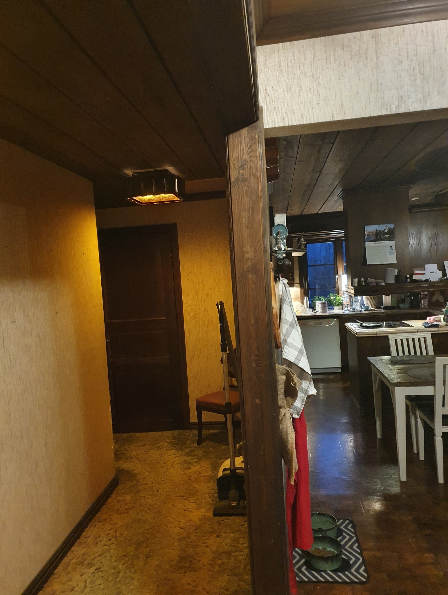 Det är idag avväxlat med pelare där takstolarna byter riktning, bifogar en bild från frugans Instagram. (Detta var 2 år sedan, nästan alla ytskikt är nya i matsal/vardagsrum.)