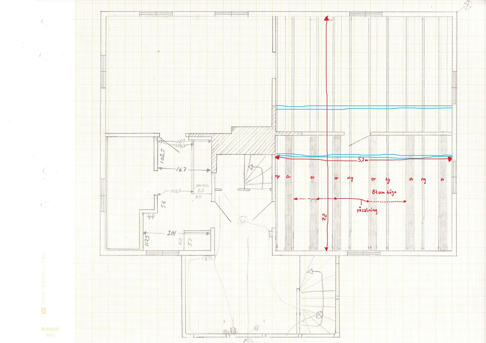 Jag har ett timmerhus två vån + vind, flyttat & uppsatt 1865. Läge nord-syd, murstock något förskjuten mot norr. Syd om murstocken är det på båda våningarna två rum i läge öst & väst. Här var till 1936 ett rum på var våning med mått nord - syd 5,2m & öst - väst 7,2m. Man behövde nog fler rum och troligen minska gung i golvet. Bjälklaget hade då 6st bjälkar 8tum höga på c/c 70 - 110cm, efter omläggning av golv på våning två så finns nu 3st 8x2tums reglar där det var glest med bjälkar. Alla nu kryssade i 6 linjer & de gamla är påsalade för att de inte var riktigt i våg eller raka på någon ledd. Utrymmet fyllt med markisolering underst (för stegljudsdämpning) & vanlig stenull upp till golvet.