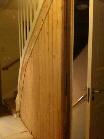 Så riv bort panelen få se om trappen på något sätt är fäst i reglarna?