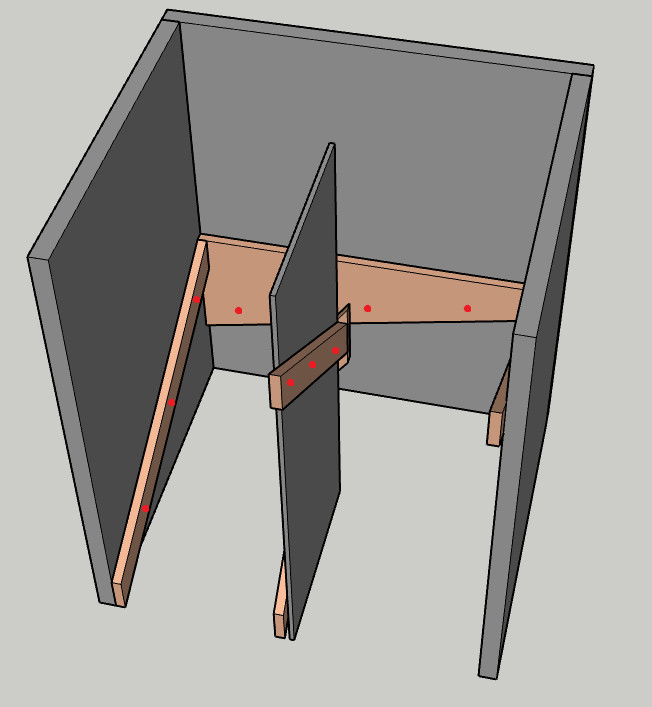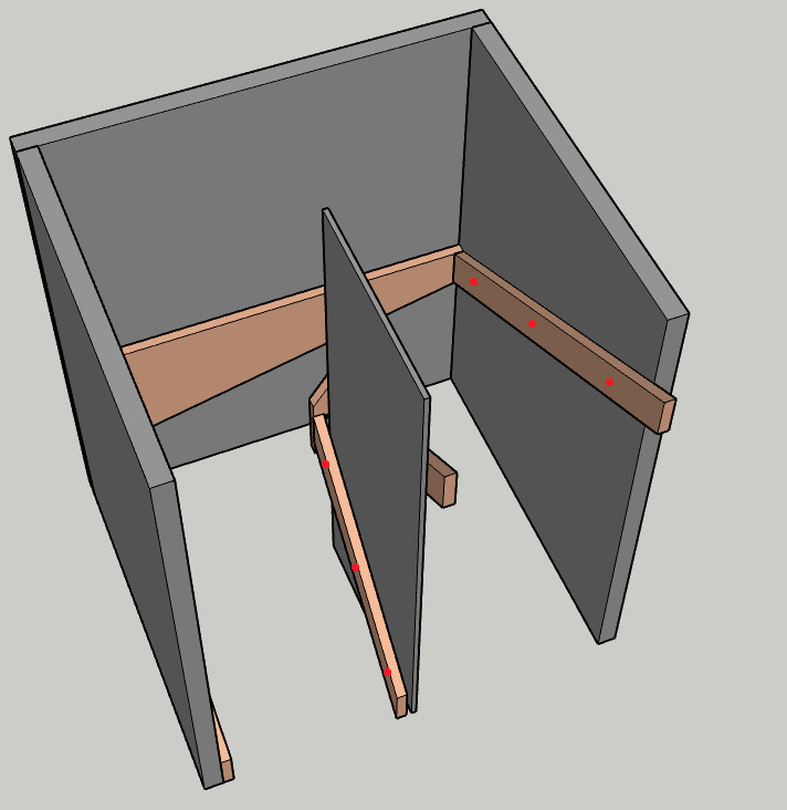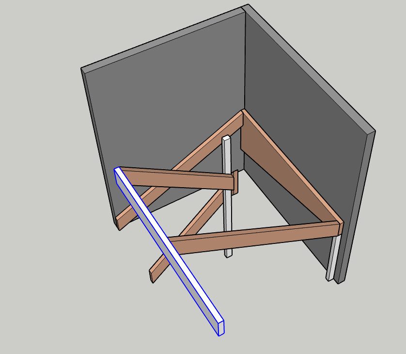 Vår kommande trappa kommer att vara fäst i övre bjälklaget, ha vangstycket för övre loppet fäst i väggen (lite för att undvika svikt, lite för att kunna "dra in" trappan mot väggen) men ha de motstånde hörnen och mitten stöttade av stolpar.