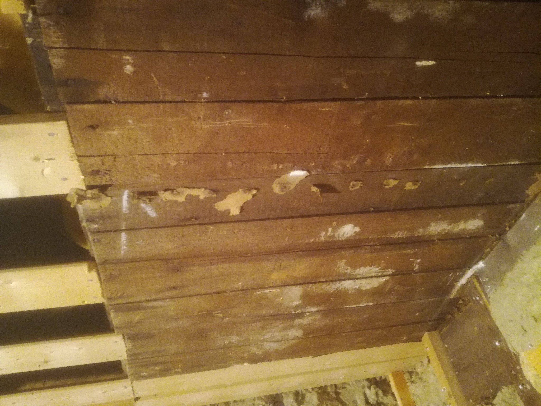 Rivit bort dåligt plank, det här längst mot väggen känns friskt, men lite vita fläckar här å där, göra rent och behålla eller byta ut? Ena takbjälken är svart, men suttit där sen 1905, torr. Byta ut eller behålla?