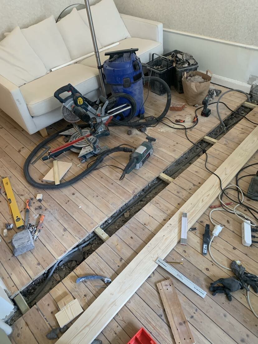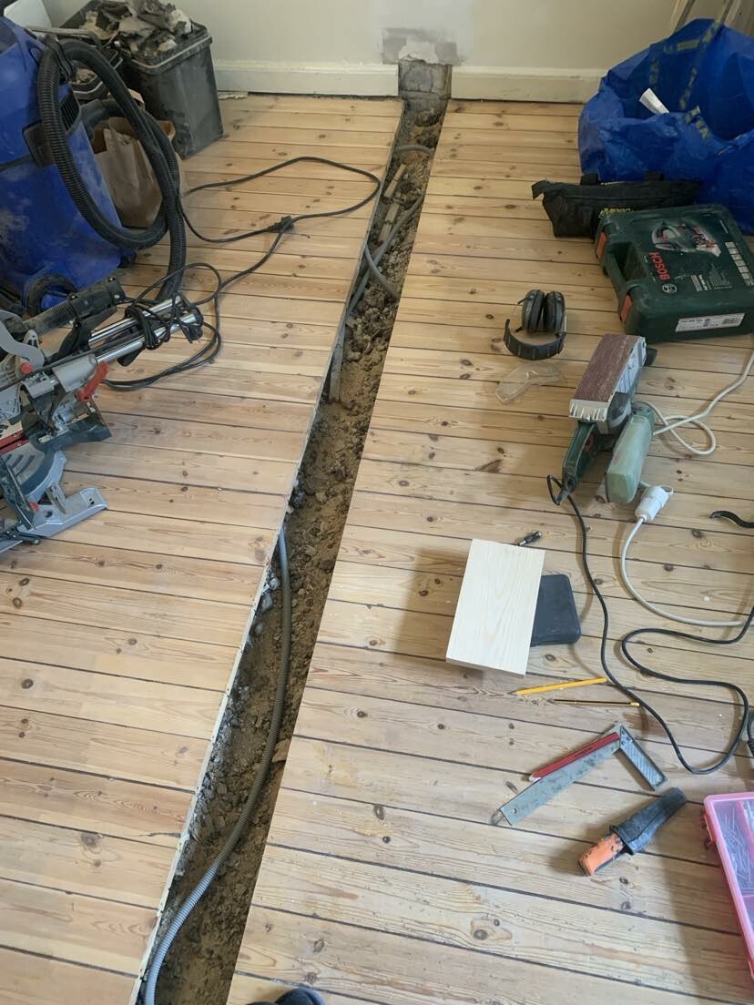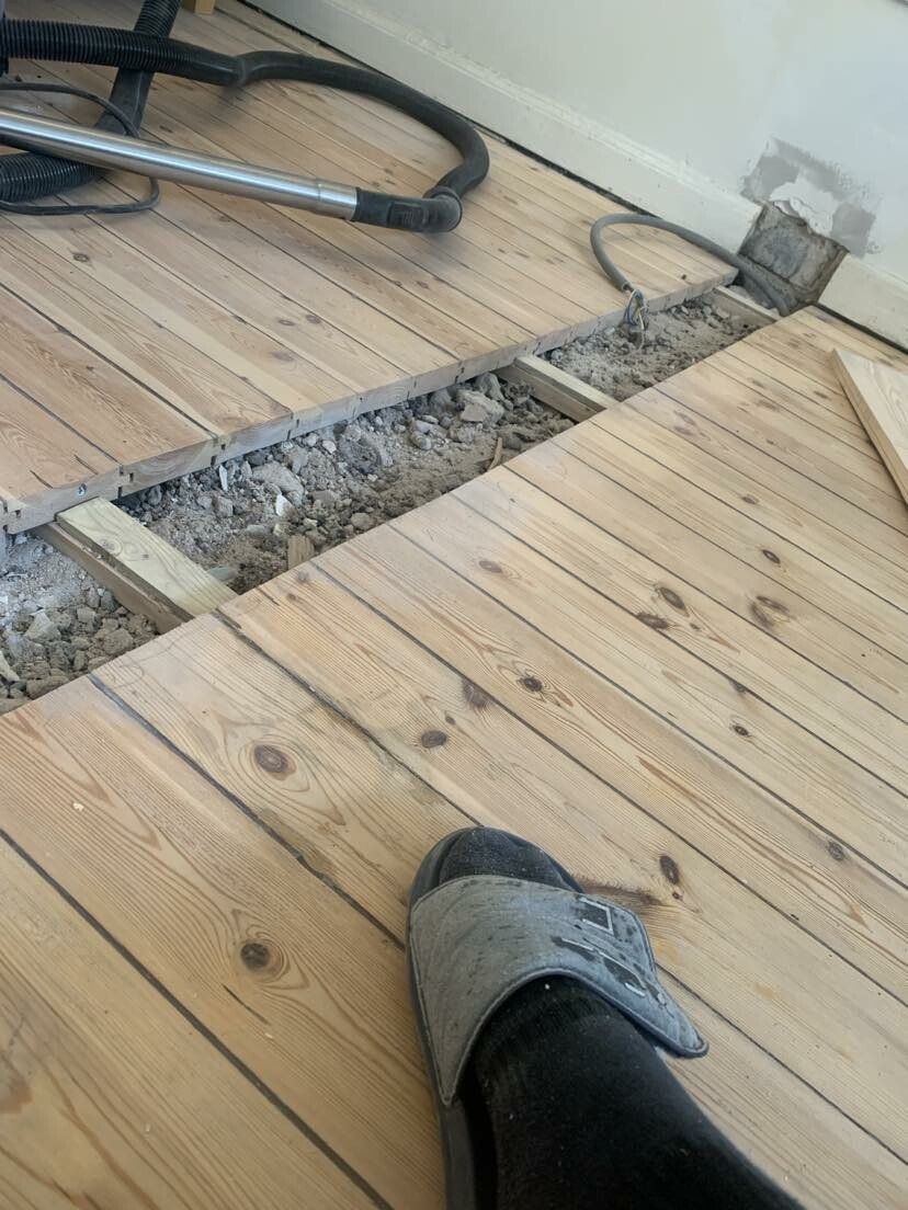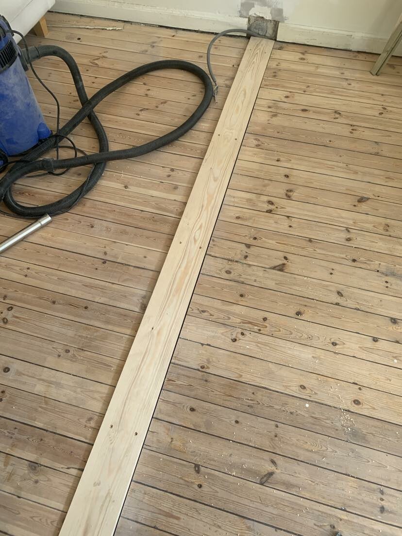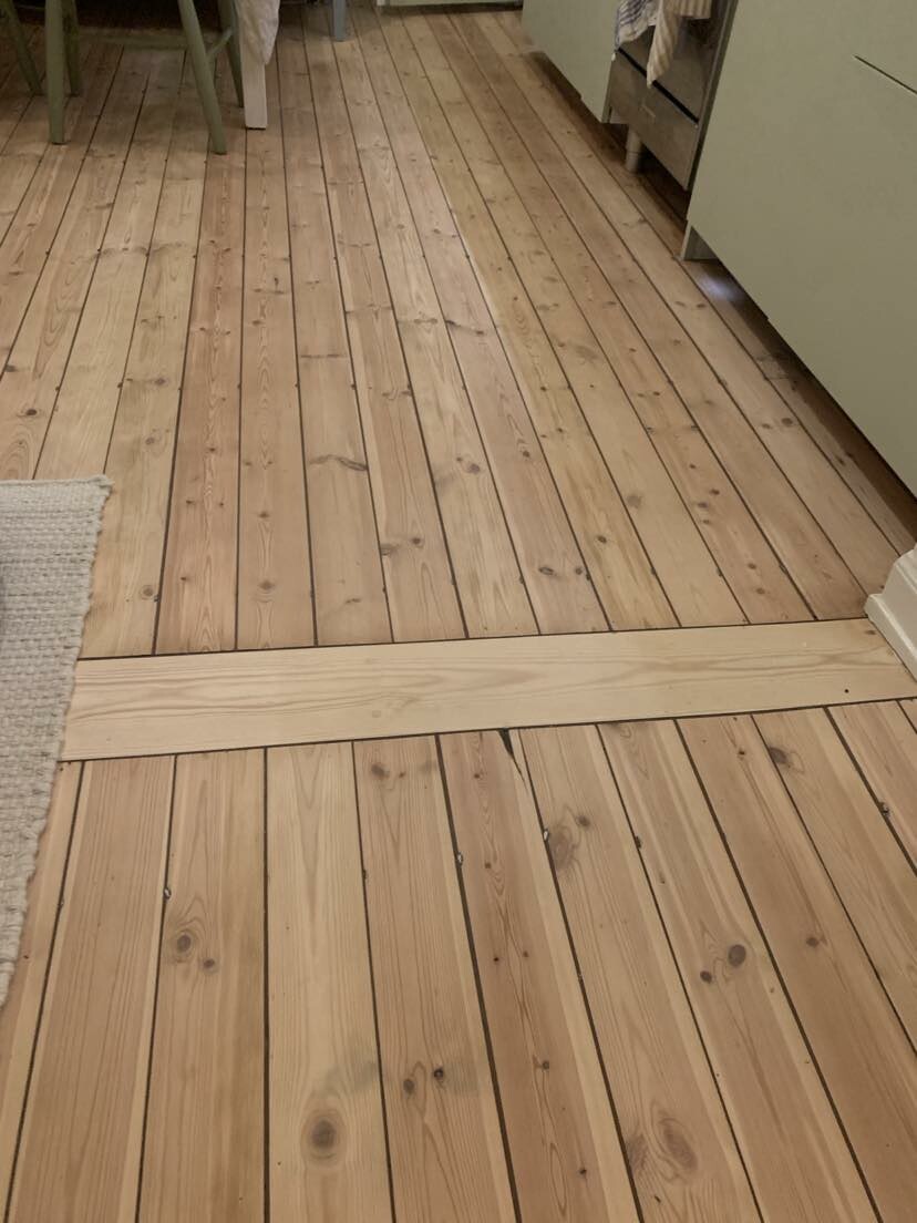 Bild 4: Plankan typ på plats men mycket jobb med slipmaskin osv för att få den att passa in både på bredden och höjden, stora höjdskillnader överallt på golv från 1920 och detta var ju två olika rum innan..