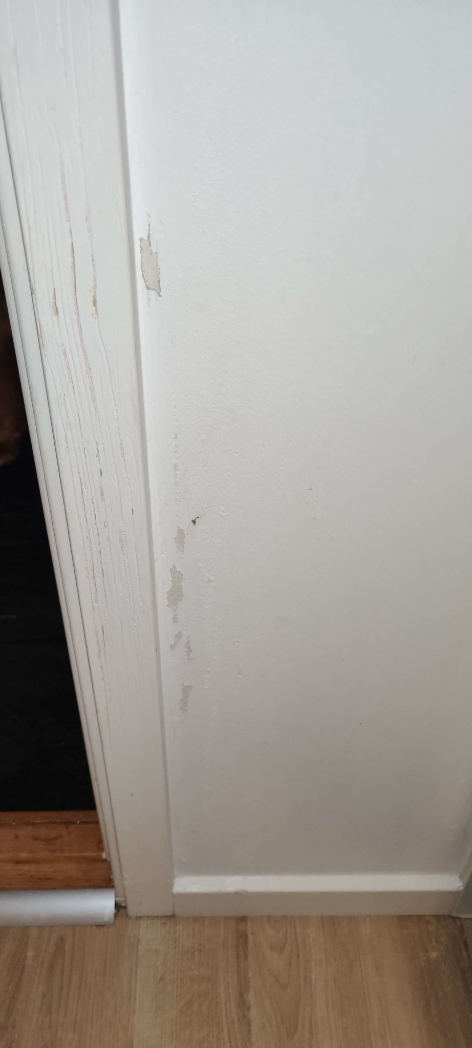 Efter ett försök till ensamhetsträning med valpen så har han rivit upp en del av väggen (färg) och dörrlisten.