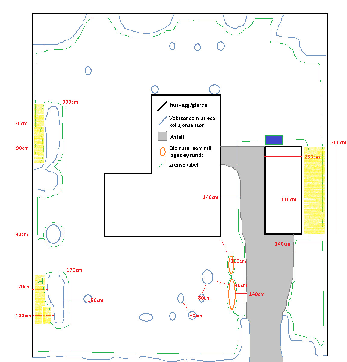 Jeg legger ved en tegning av hagen. Hele tomten er 1050kvm. Området som skal klippes er ca 850kvm. Områdene jeg er usikker på om den vil klare er merket med gult på tegningen. Kabelen som er tegnet inn er slik det fungerte best for bosch'n som ble stjålet.