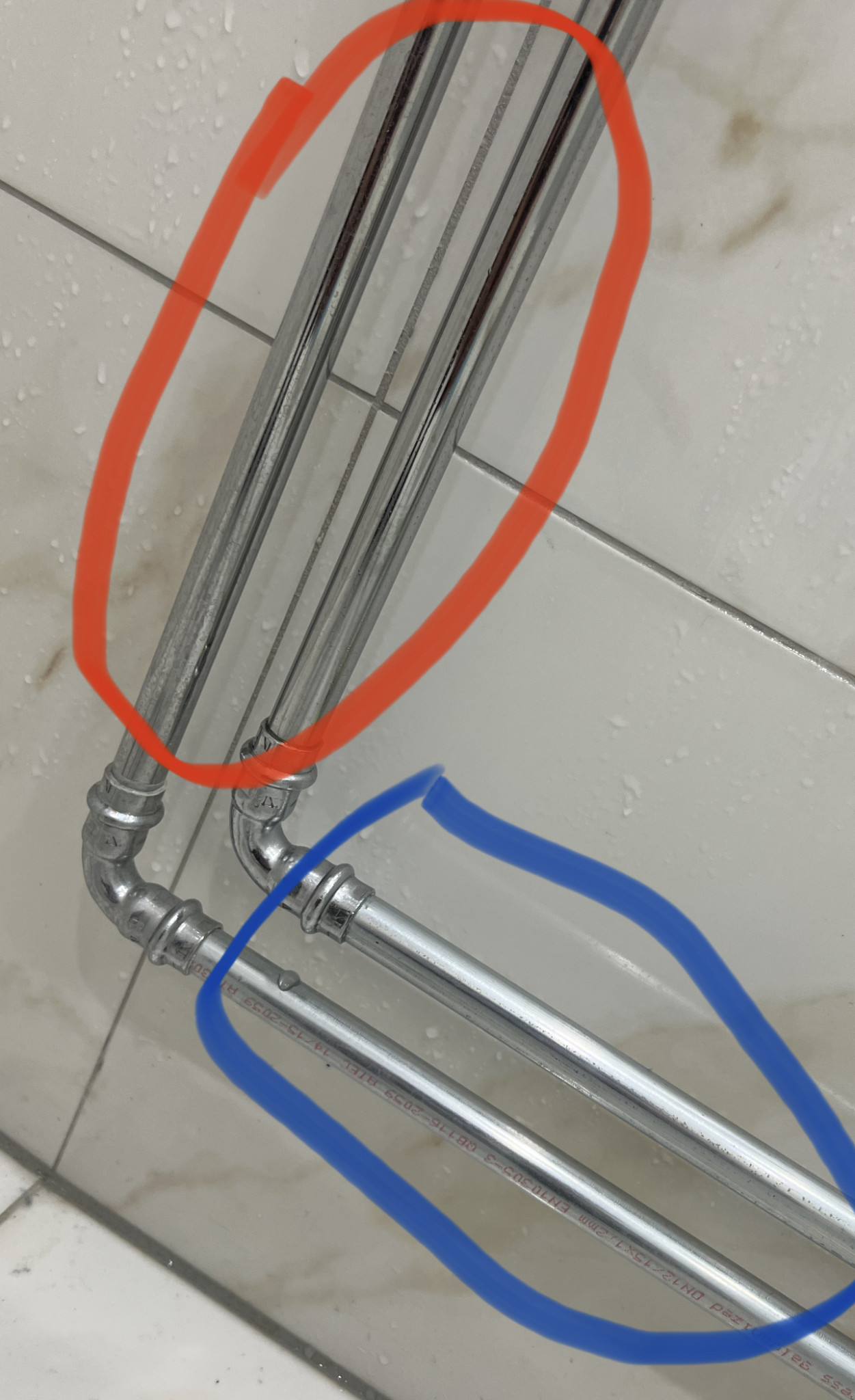 Vid första anblicken så ser de där blåmarkerade rören ut som elförsizinkade å vid en vidare blick så ser man att dom har text på sig å det har inte crom rör. Dessa rör är EJ gjord för färskvattensystem....hur tänkte dom där...