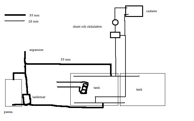 Men åter till frågan för ett ögonblick. Går det att gå med 35 rör från pannan till en t-koppling (28-35-28) och gå med en 28 till varje tank, och sen docka på shunt och cirk.pump på ett av dessa 28 rör. och sen lika på returen?