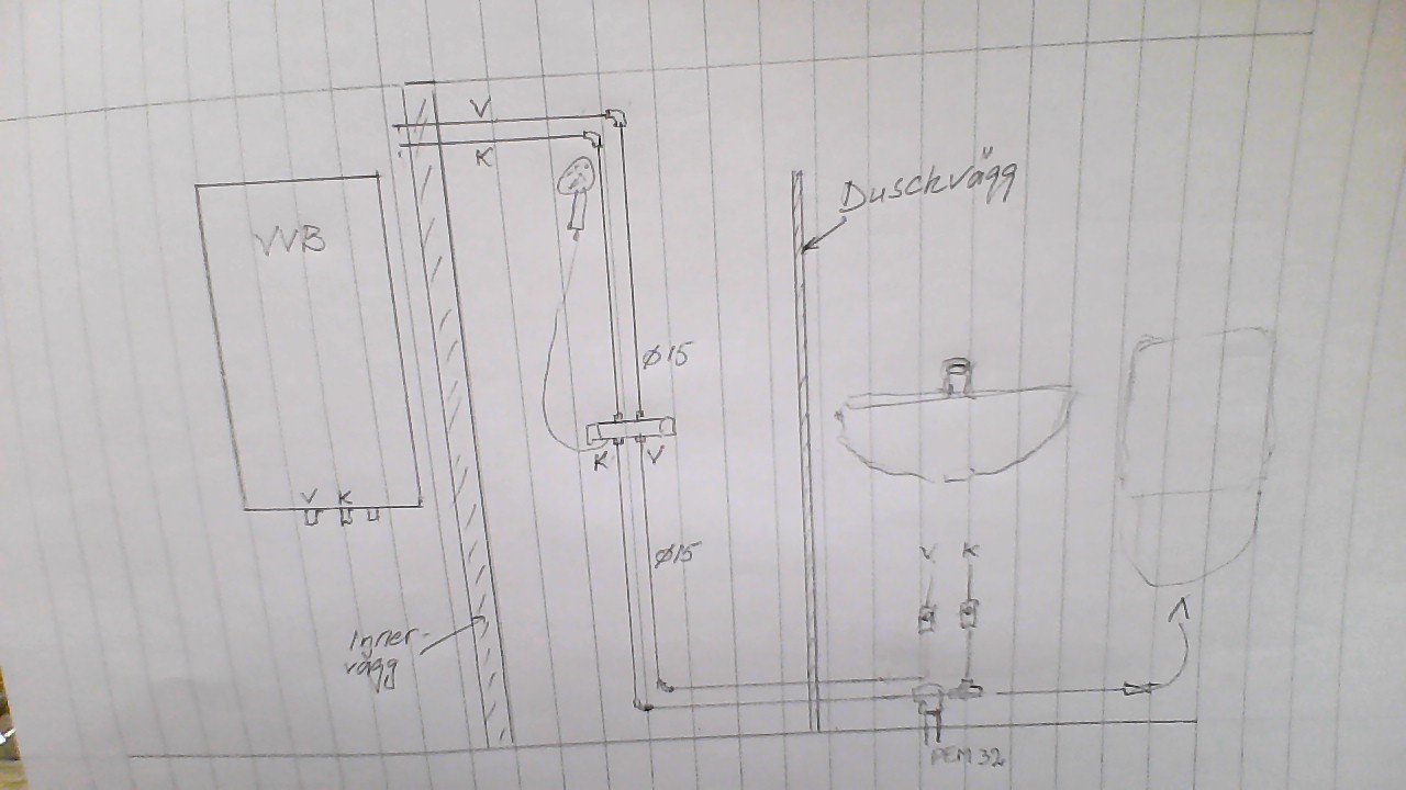 - Jag vill, mest av estetiska skäl och utrymmesskäl dra 15mm rören från tak, genom duschblandaren, ner till golvet och gå igenom duschväggslisten strax ovan golvet, för att på andra sidan duschväggen ansluta till inkommande PEM och leda vatten till handfat, toalett och under handfatet genom väggen till köket som ligger vägg i vägg med toaletten.