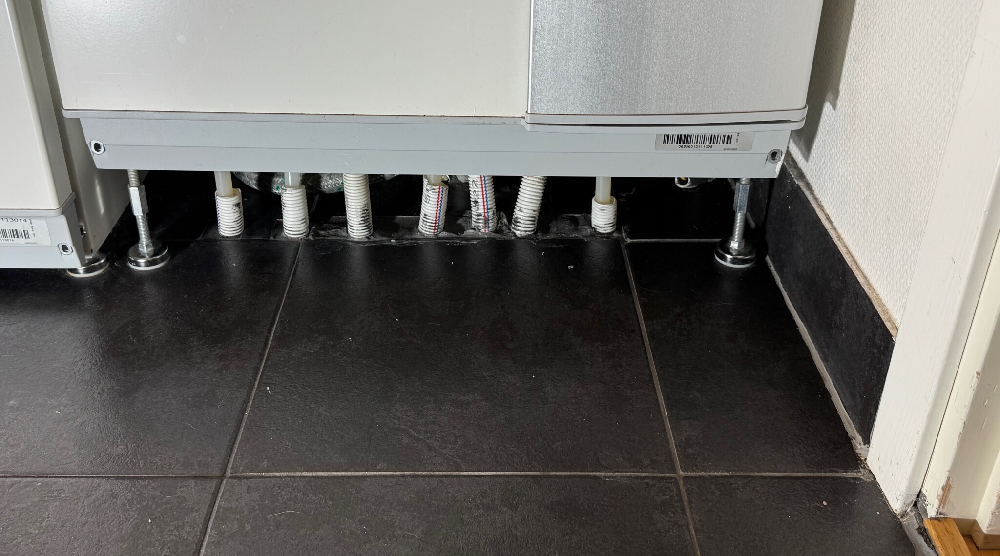 När man tittar lite översiktligt ser det dock inte jättetokigt ut. Ja, rören går genom golv, men verkar ju vara bra inbakade i någon tätningsmassa.