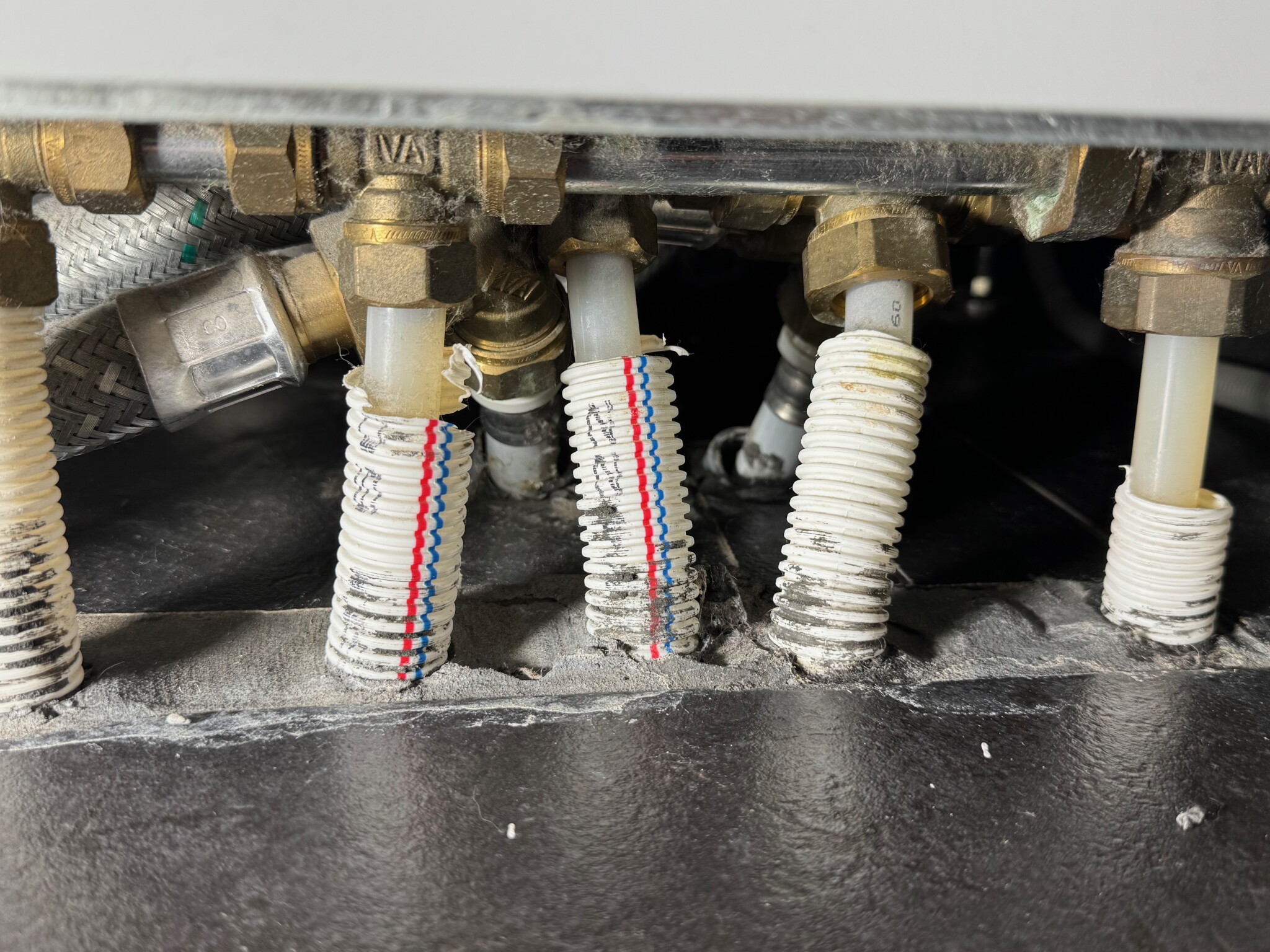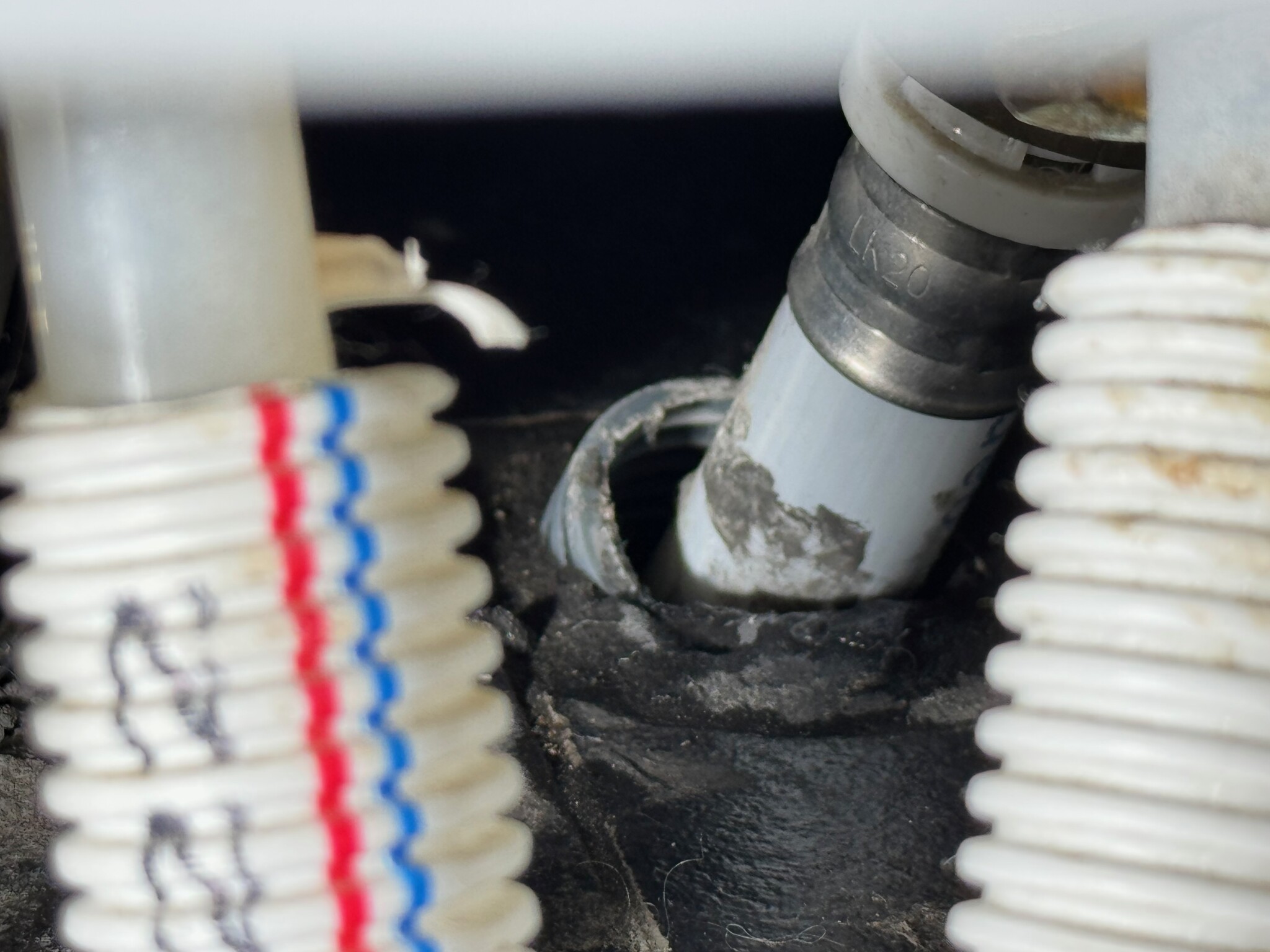 När det för en vecka sedan blev stopp i avloppet för kondensvatten från VP rann det ut mycket vatten under VP i flera dagar, och då ser man (efter att jag har städat från åratals med damm och mög) att det finns ytterligare två rörgenomföringar längre in, där det ser ut att kunna rinna vatten rakt ner i flexröret som skyddar rörledningen.
