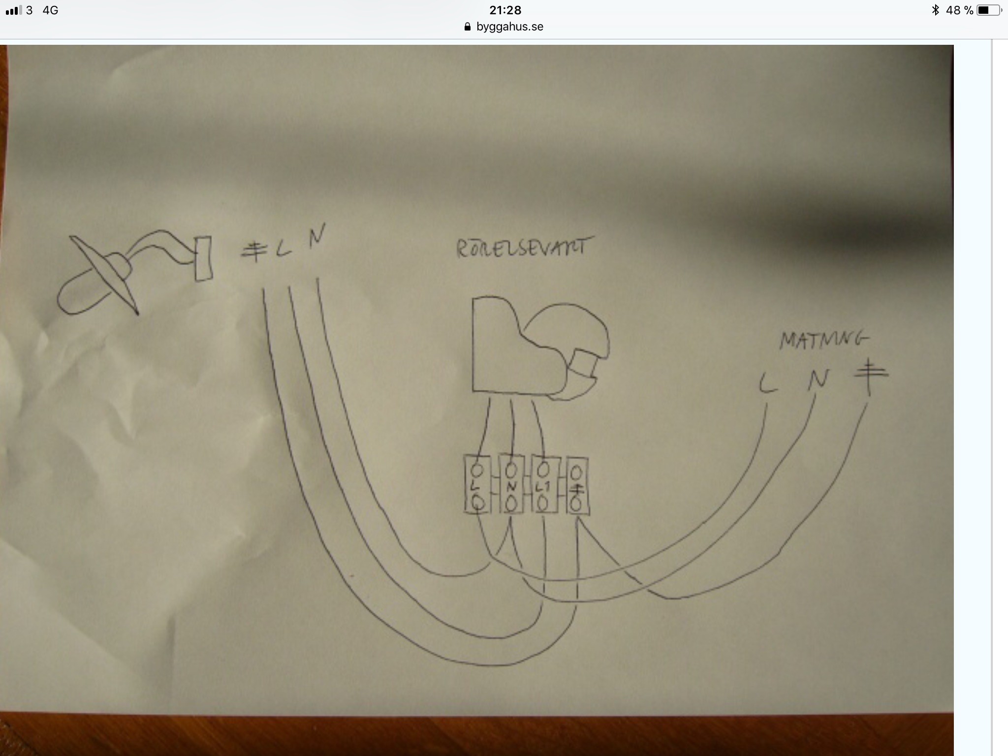 Efter att ha läst ditt inlägg förstår jag lite bättre principen för att koppla trådar förbi rörelsedetektorn. Men förstår inte de där fyra trådarna till armaturen. Det är 4 trådar i rörelsedeckaren enligt skiss.