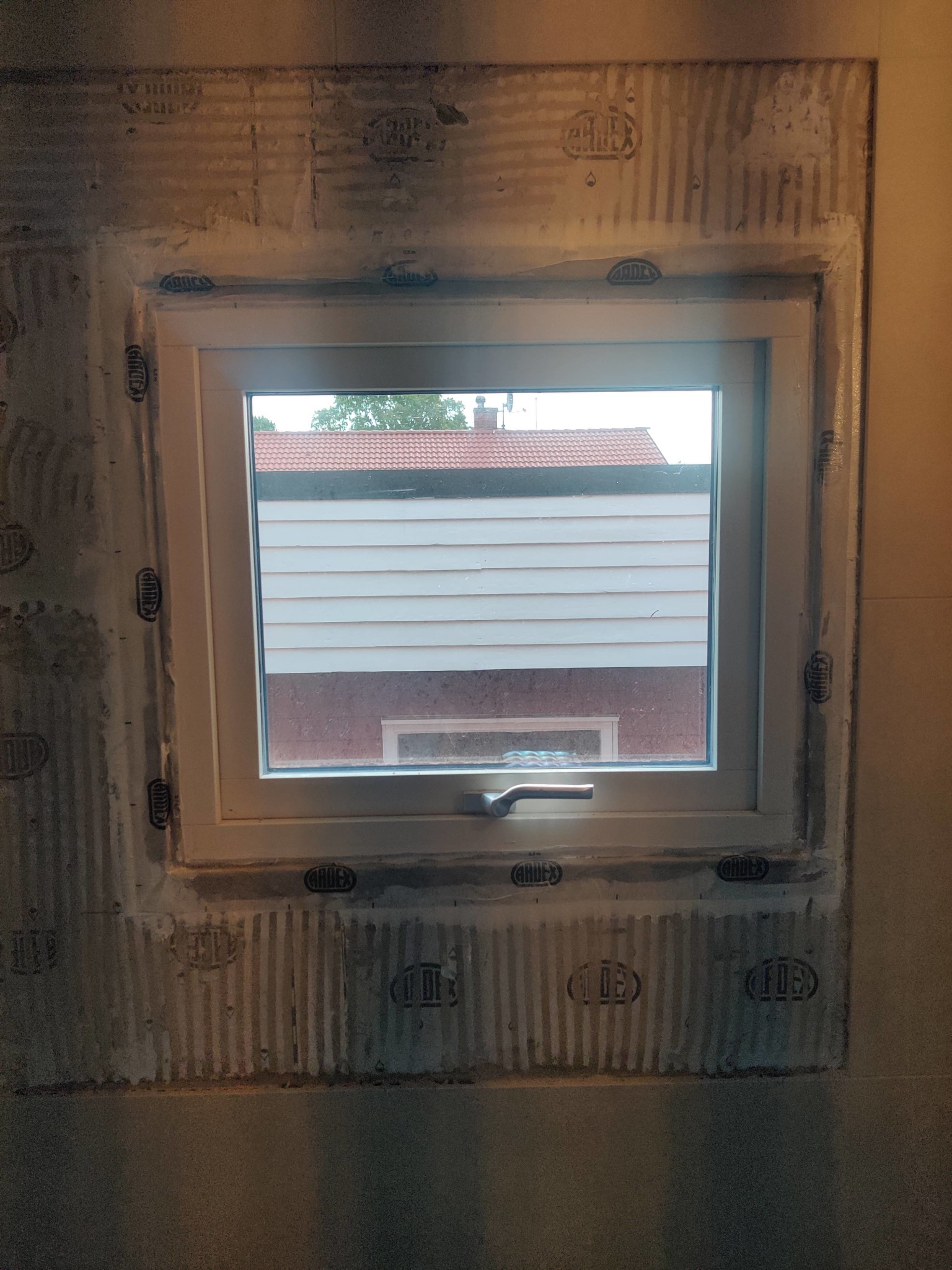Entreprenören gick helt på vår, BKR och tillverkaren av tätskiktets linje, d.v.s knacka ner kaklet runt fönstret och skarva tätskiktet enligt konstens alla regler samt ansluta mot karmen.