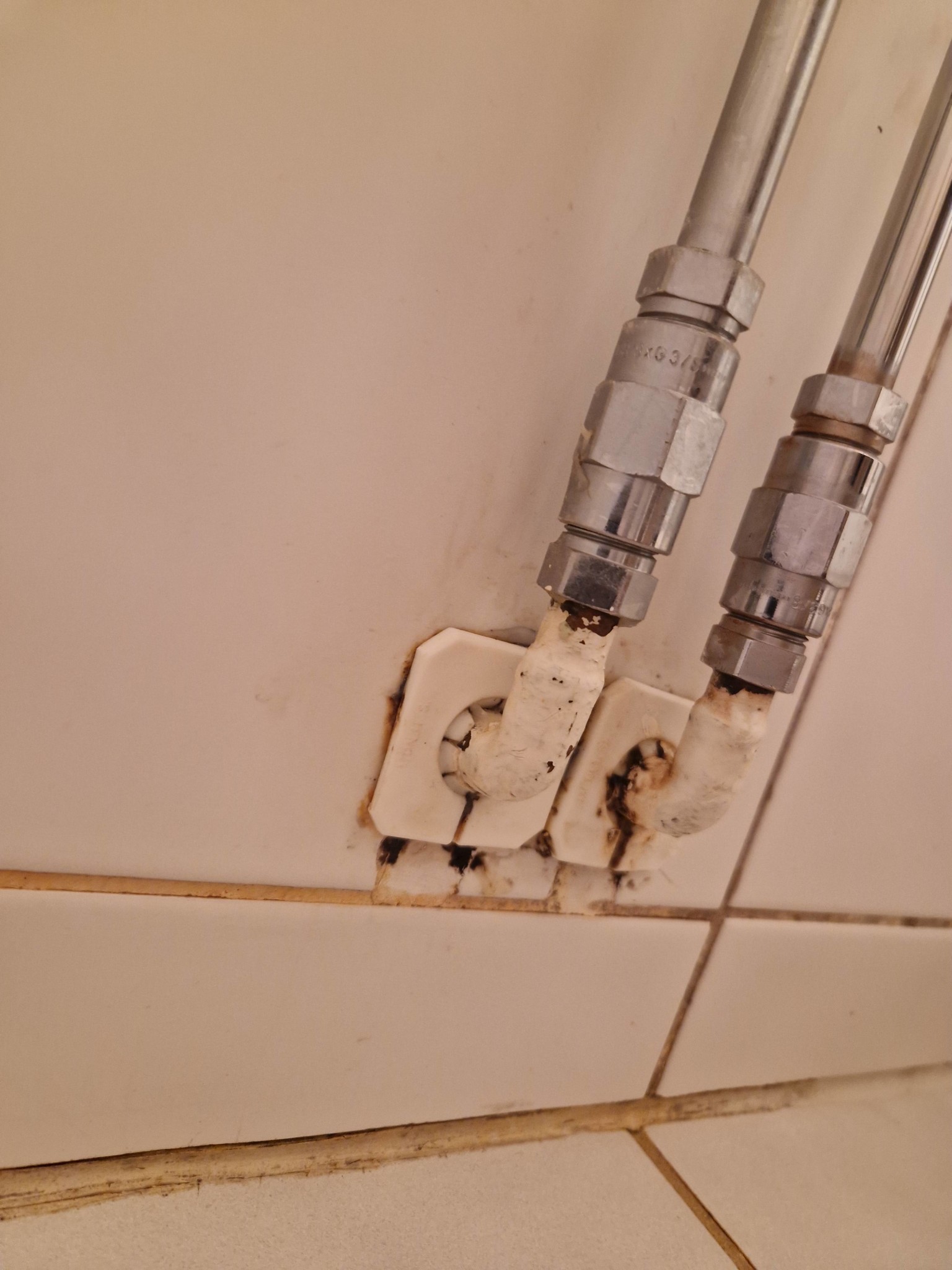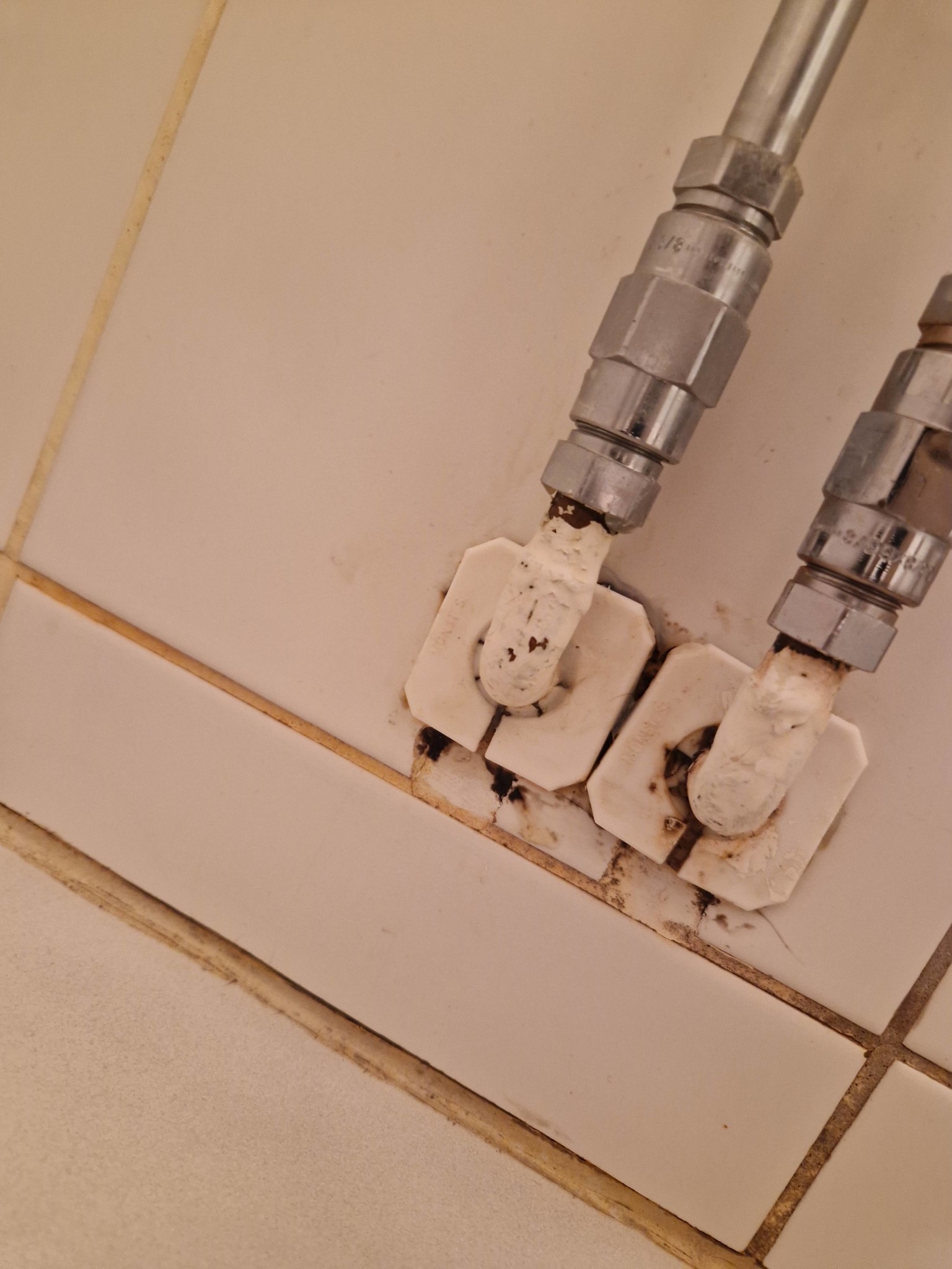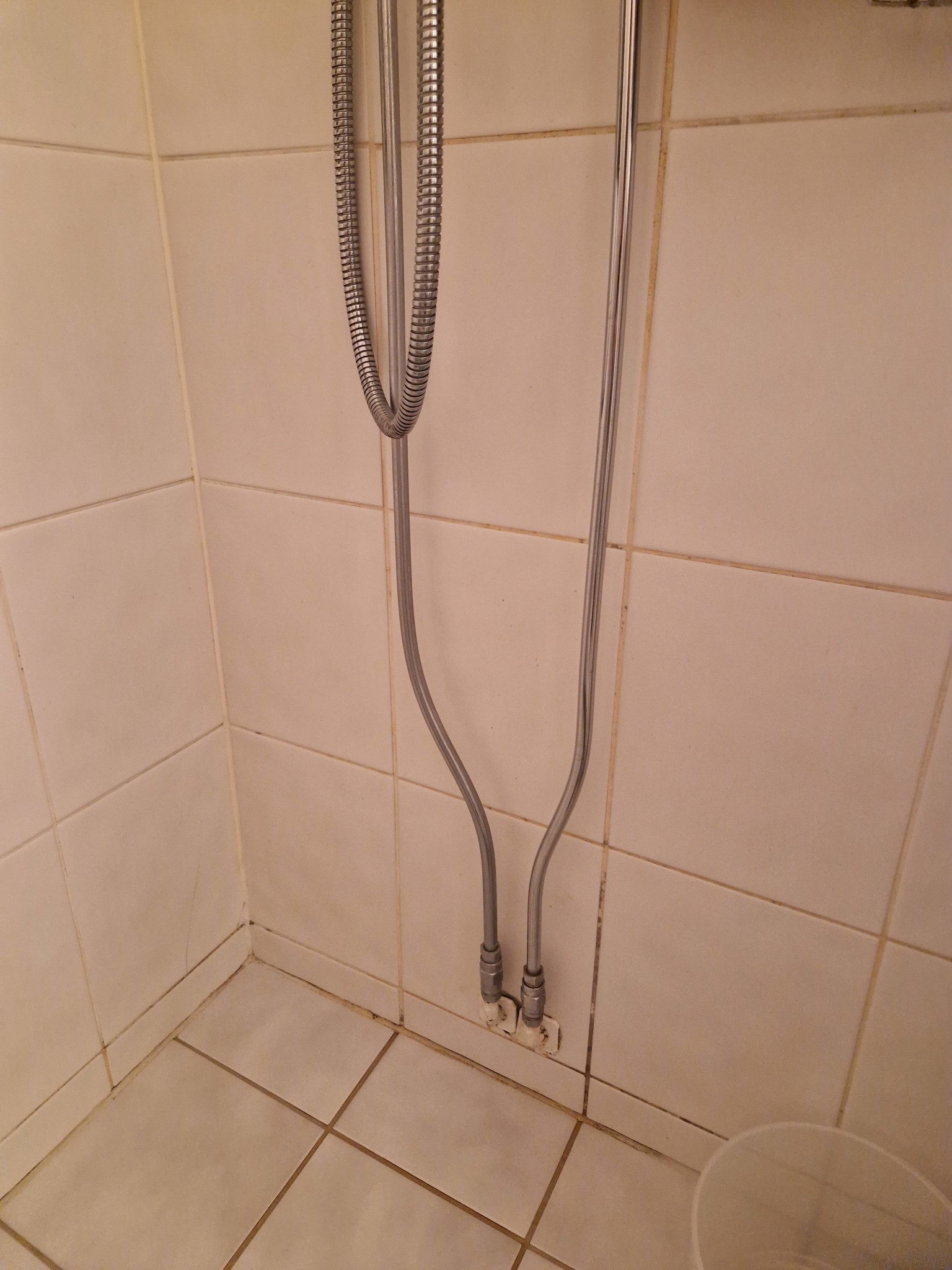 Så här ser lösningen ut i duschen, rör rakt genom vägg. Jag antar att det kanske stod ett badkar där tidigare. Förstår ju att det här inte är optimalt och någon gång i framtiden ska vi göra om hela badrummet men tills dess kanske det behövs någon bättre lösning än det här för att undvika fuktskador (om de inte redan tillkommit)?
