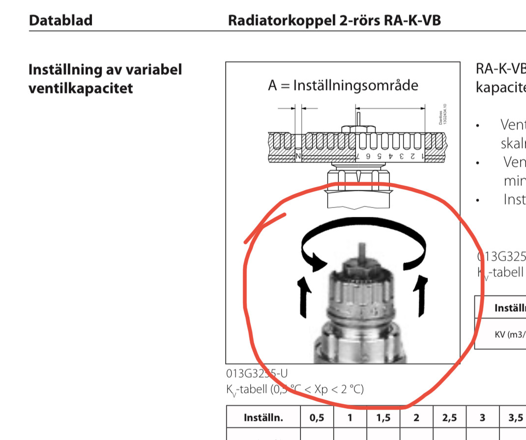 Antal varv på inställningen spelar ingen roll. Läs vad den pekar och ställ i maximalt öppet tills du fått fram värme igen.
