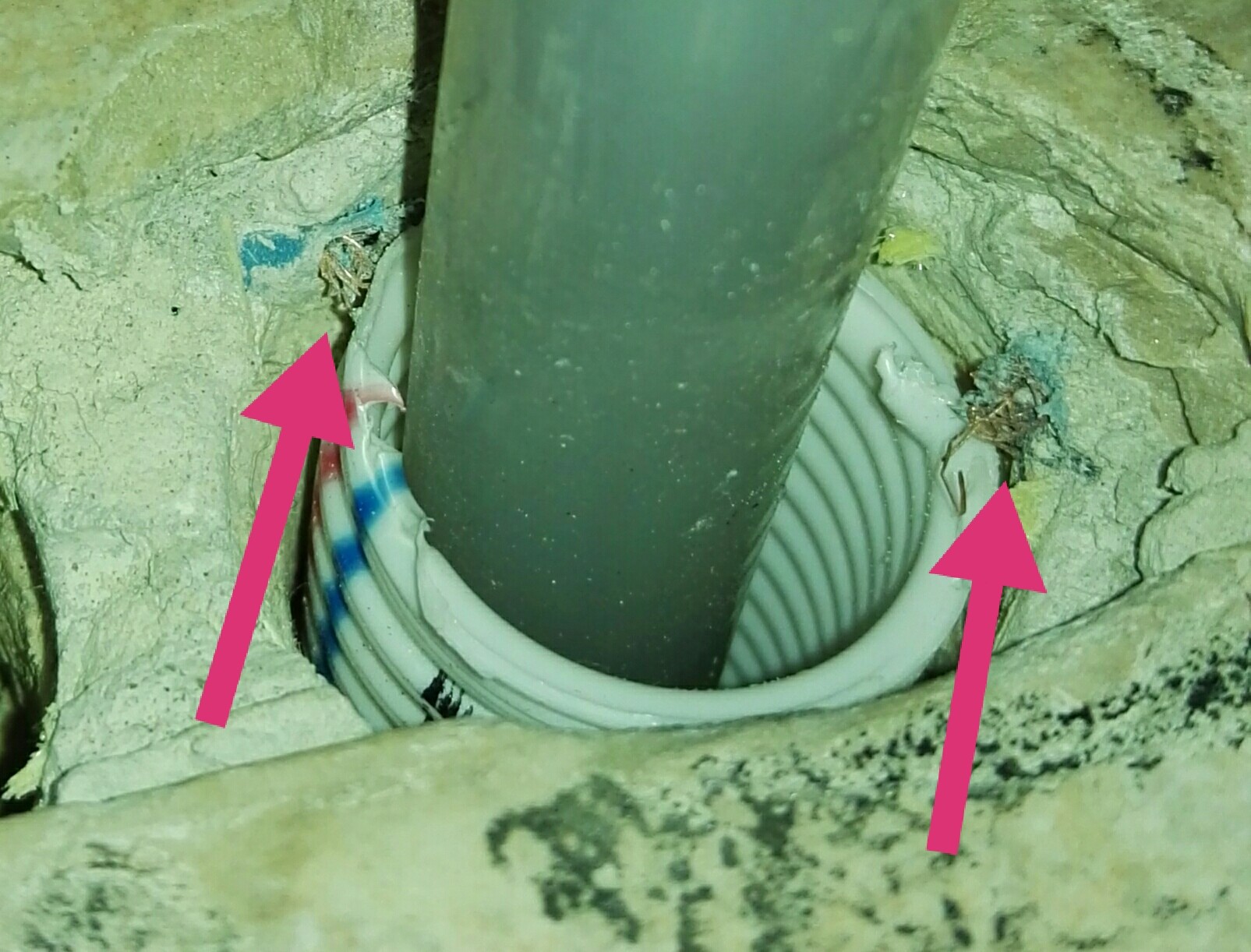 Vi har haft en rörmokare här som har installerat vattenburna radiatorer i hela nedervåningen. I köket har vi klinkergolv med ett ca 15 år gammalt T2 golvvärmesystem där rörmokaren borrat hål för rören ner i krypgrunden. Självklart har han lyckats hitta en slinga och borrat hål rakt igenom den (se bild). Man tänker ju att de förut måste ha gjort hål i golv med golvvärme, och att det kanske finns något slags instrument som kan mäta fram var slingan går. Det finns ju mätare för att hitta elkablar i vägg, tänker jag...